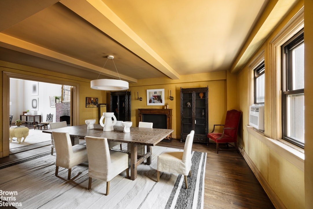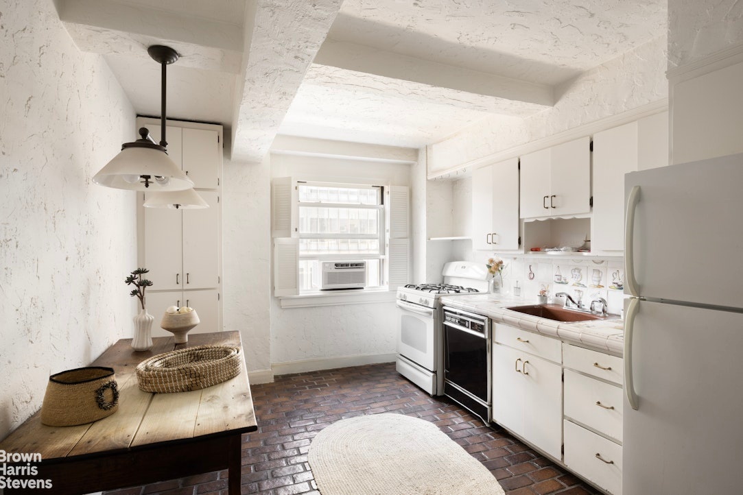 The windowed chef's kitchen features classic brick floors and a double beamed ceiling, bright southern windowed exposure as well as the bonus of an eat-in dining area.