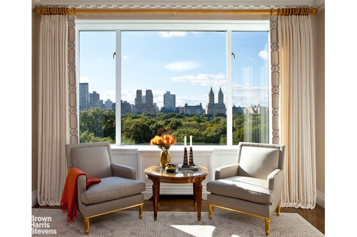 A private elevator landing opens onto an elegant square gallery which leads to a 70 foot enfilade of impressive frontage overlooking Central Park. The entertainment rooms span over 50 feet and include a grand living room, formal dining room and a stunning paneled library. Each of the entertaining rooms has enormous picture windows framing breathtaking views of the Park, as well as west and southern sweeping views of the Manhattan Skyline. Adjacent to the dining room is an amazing 20' x 21' renovated chef's eat-in kitchen with top-of-the-line appliances from Wolf and Miele.The kitchen faces east and enjoys ample morning sunlight, custom cabinetry, and excellent storage space. The oversized breakfast area is perfect for gathering with family and friends, and is ideal for informal entertaining.