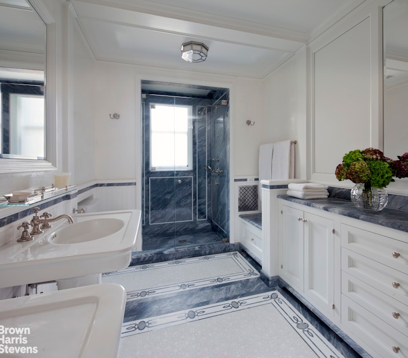 To the north of the gallery is the very private primary bedroom suite, with oversized picture windows overlooking Central Park. An entire adjacent bedroom now serves as a dressing room with custom designed storage and hanging spaces. This brilliantly thought out layout allows for access to dual bathrooms on either side of the dressing room, with an additional walk-in closet off the corridor.