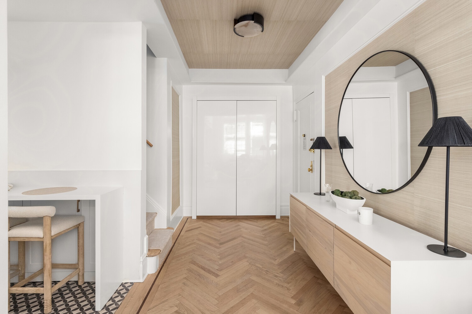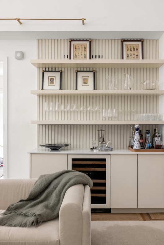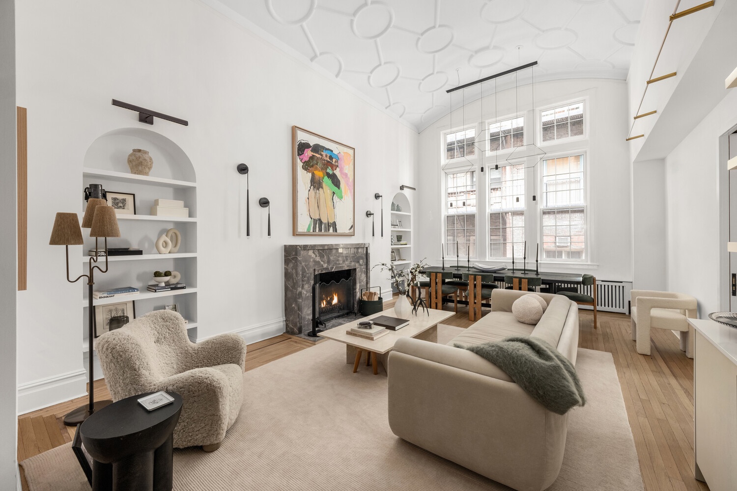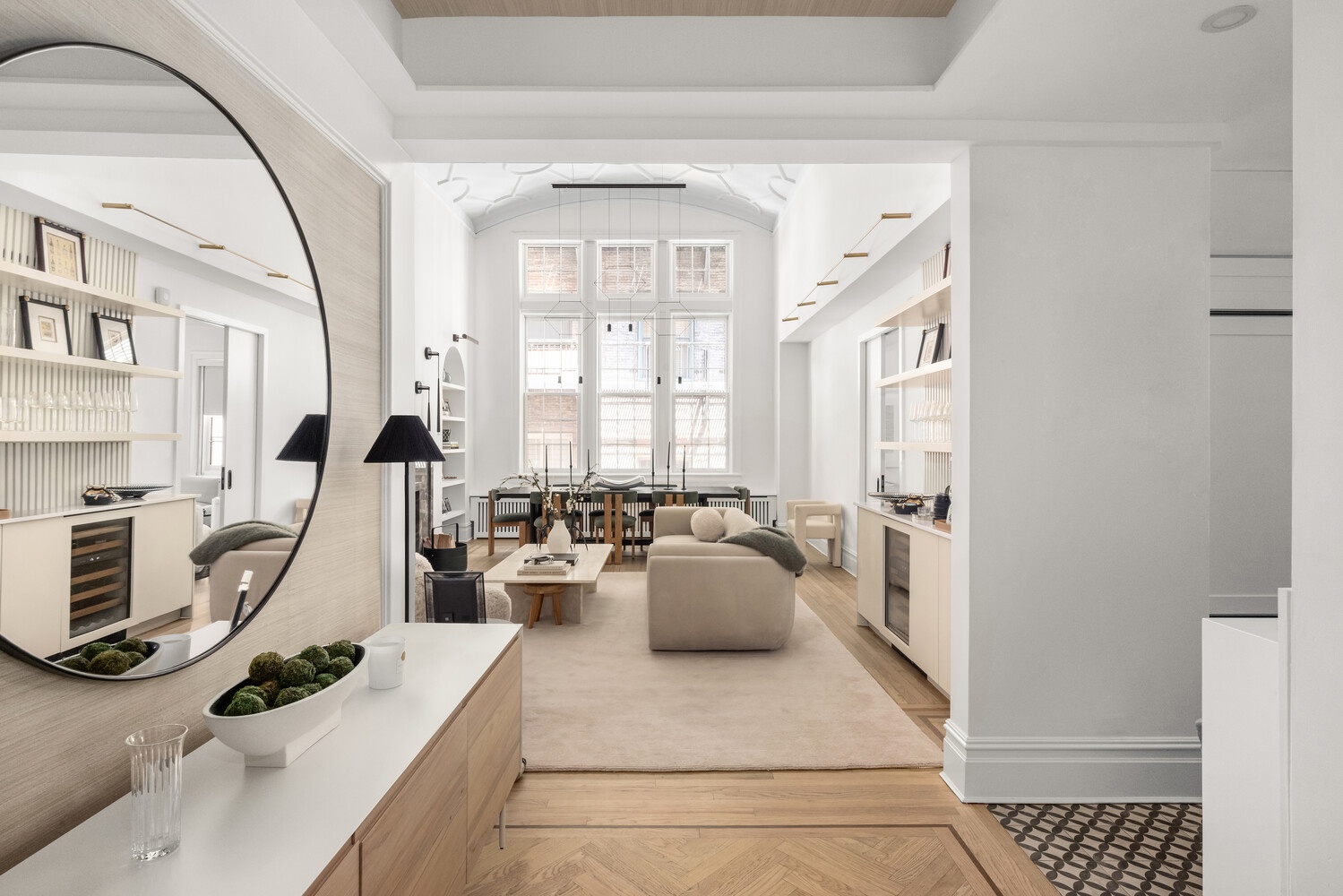 From the moment you arrive, the home radiates elegance. A gracious entry foyer with recessed ceiling detail opens into a dramatic double-height great room designed to impress. Soaring 15'8" coffered ceilings, a stately wood-burning fireplace with custom marble mantel, three oversized casement windows, and immaculate hardwood floors create a living space that is both grand and welcoming. Additional highlights include arched built-in bookshelves and a custom bar with Sub-Zero wine fridge and ample storage, ideal for entertaining. Sonos speakers are seamlessly integrated throughout the apartment, offering a high-quality audio experience in every room.