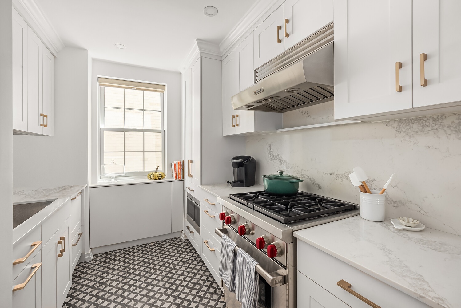 The chef's kitchen is as functional as it is refined, featuring a vented Wolf 4-burner gas range, Sub-Zero refrigerator, Fisher & Paykel dishwasher, and marble countertops, all framed by sleek custom cabinetry and a breakfast bar.