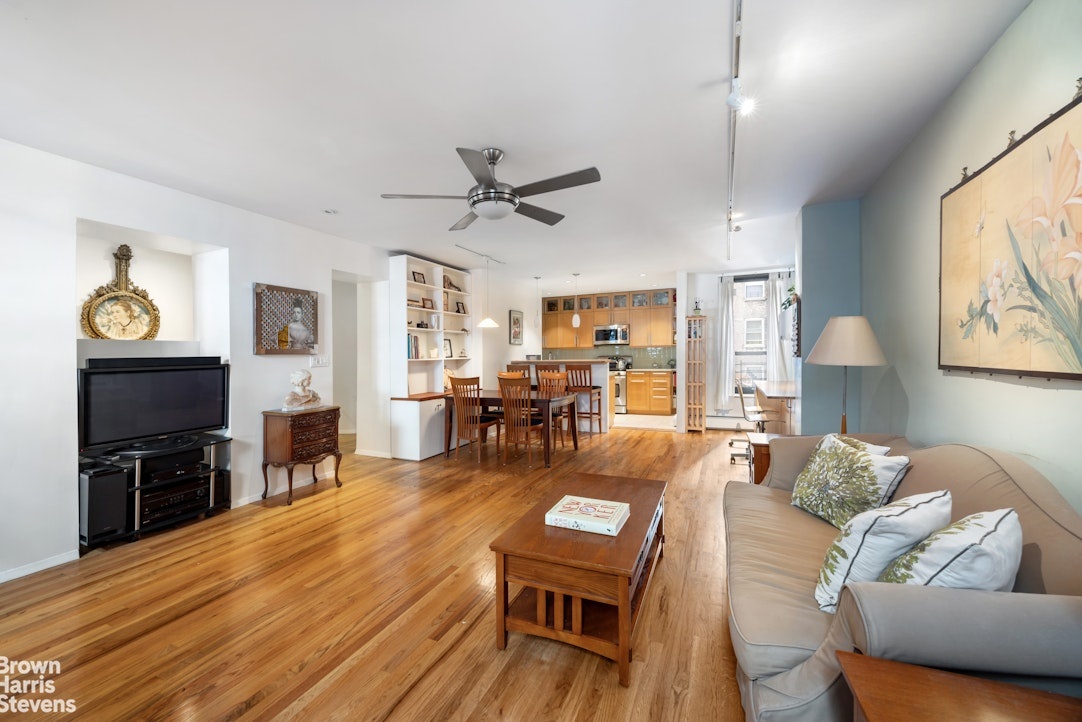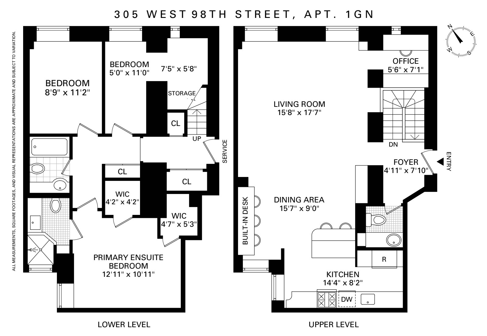 Conveniently located on the first floor, Apartment 1GN is a three-bedroom, two-and-a-half-bathroom unit with three exposures and an ideal layout. A dedicated foyer greets you upon entry, with a powder room thoughtfully positioned on the left, and a staircase on the right that leads to the lower level of the home. Entering further into 1GN, the expansive living and dining area stretches out before you, providing you with 26" of linear space able to be reconfigured to meet your needs. The living room's large north facing windows provide picturesque views of West 99th Street's abundant historical architecture further complemented by track and recessed lighting. The windowed open kitchen features a breakfast bar, ample counter space and storage, beautiful wood cabinetry with sleek hardware, and a stainless-steel appliance suite. A dedicated home office, framed by charming exposed brick, sits nestled discreetly off the living area while a larger built-in desk, sizeable enough to accommodate three people, with expansive upper and lower cabinetry can be found opposite the dining area.