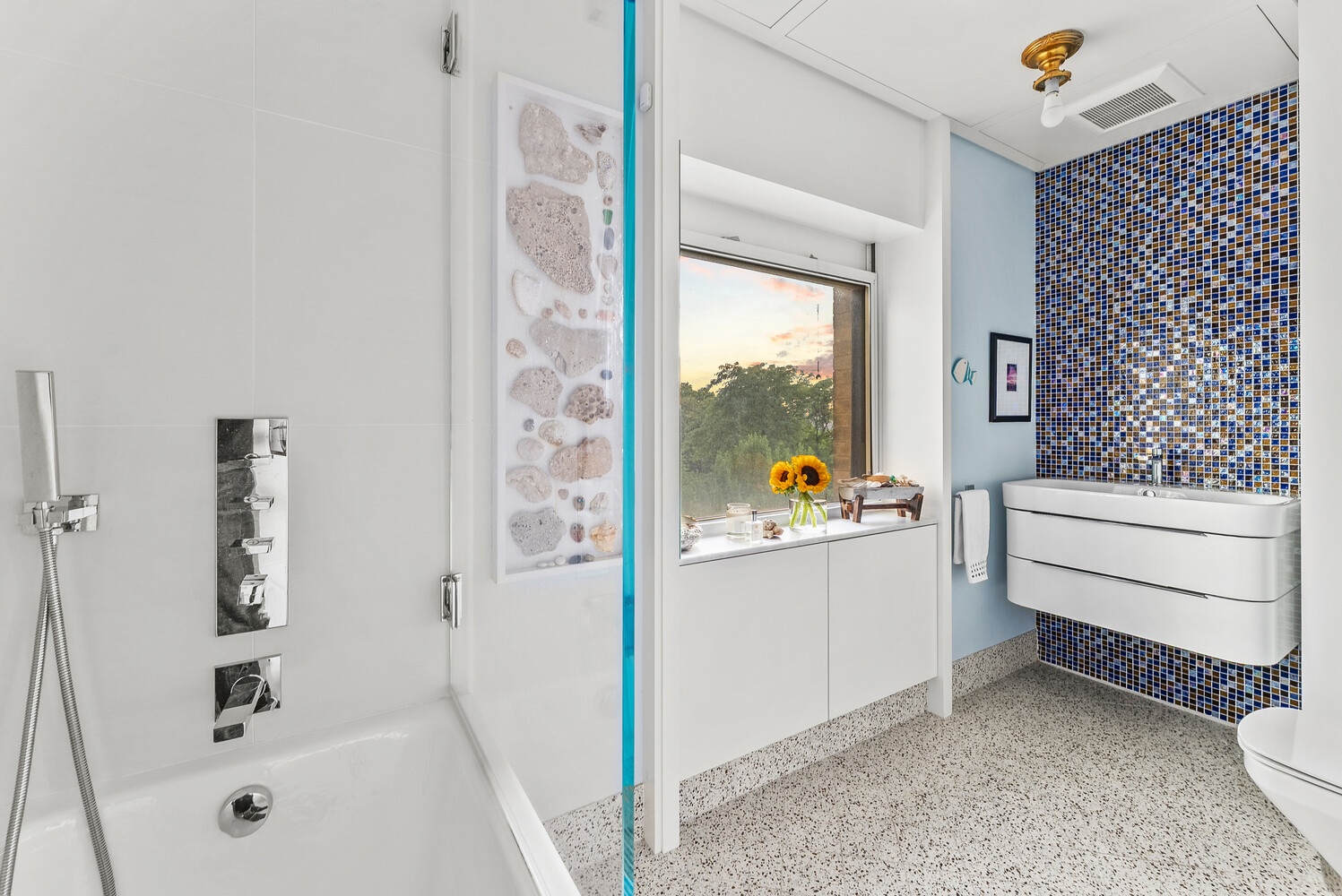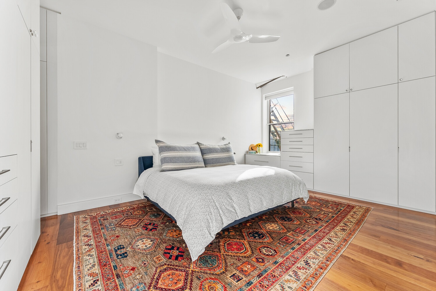 The king-size bedroom suite features cedar-lined closets and a spa-like en-suite bath with dual-sink cabinetry, high-end fixtures from Kohler, Duravit, Gessi, and Franz Viegener, and a Waterworks cast iron ceramic bathtub. Two full bathrooms and a discreet in-unit Miele laundry room round out the comfort. A queen-size Murphy bed in the living area adds flexibility for guests or office needs.