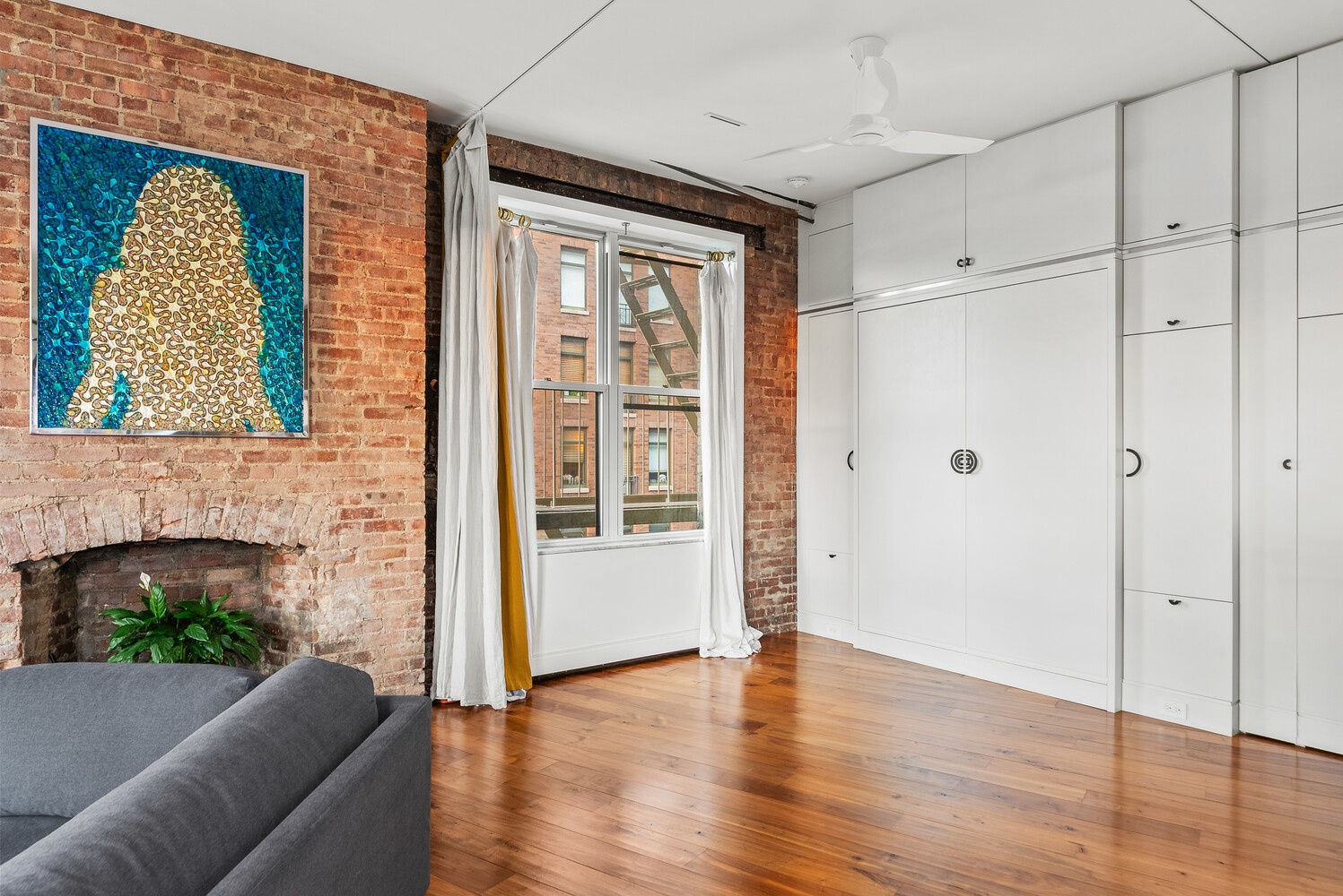 Brimming with scale, character, and natural light, the home blends classic prewar elegance - including hardwood floors, soaring ceilings, exposed brick, and a decorative original fireplace - with thoughtful, high-end enhancements. The exposed brick has been re-pointed and sealed offering a rich sense of history. Every detail has been considered with soundproofing in mind, from the custom 6-inch wide Carlisle Engineered Walnut flooring with extra soundproofing, to the full Crestron-controlled multi-room sound system, integrating Sonos and television into custom cabinetry. The lighting throughout is controlled by Ketra, offering ultimate ambiance control.