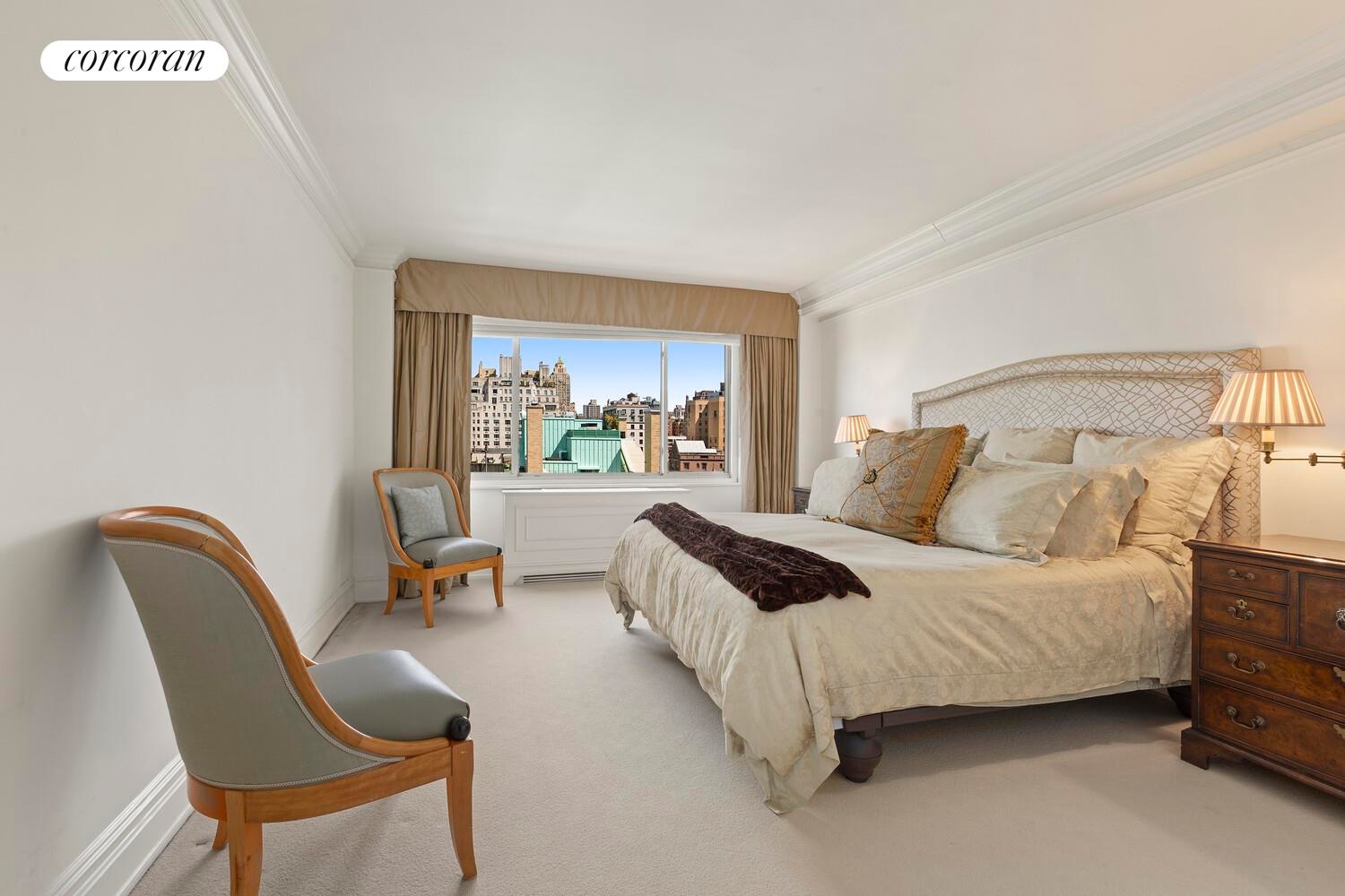 Off the entry foyer, is a powder room and a 26 foot living room facing north, overlooking beautiful limestone mansions with partial Central Park and open city views, while to the south is a large, sun drenched formal dining room. The adjacent renovated, windowed kitchen and pantry features top of the line appliances and ample storage. Three oversized bedrooms with generous closets, are filled with excellent natural light and offer iconic city and skyline views.