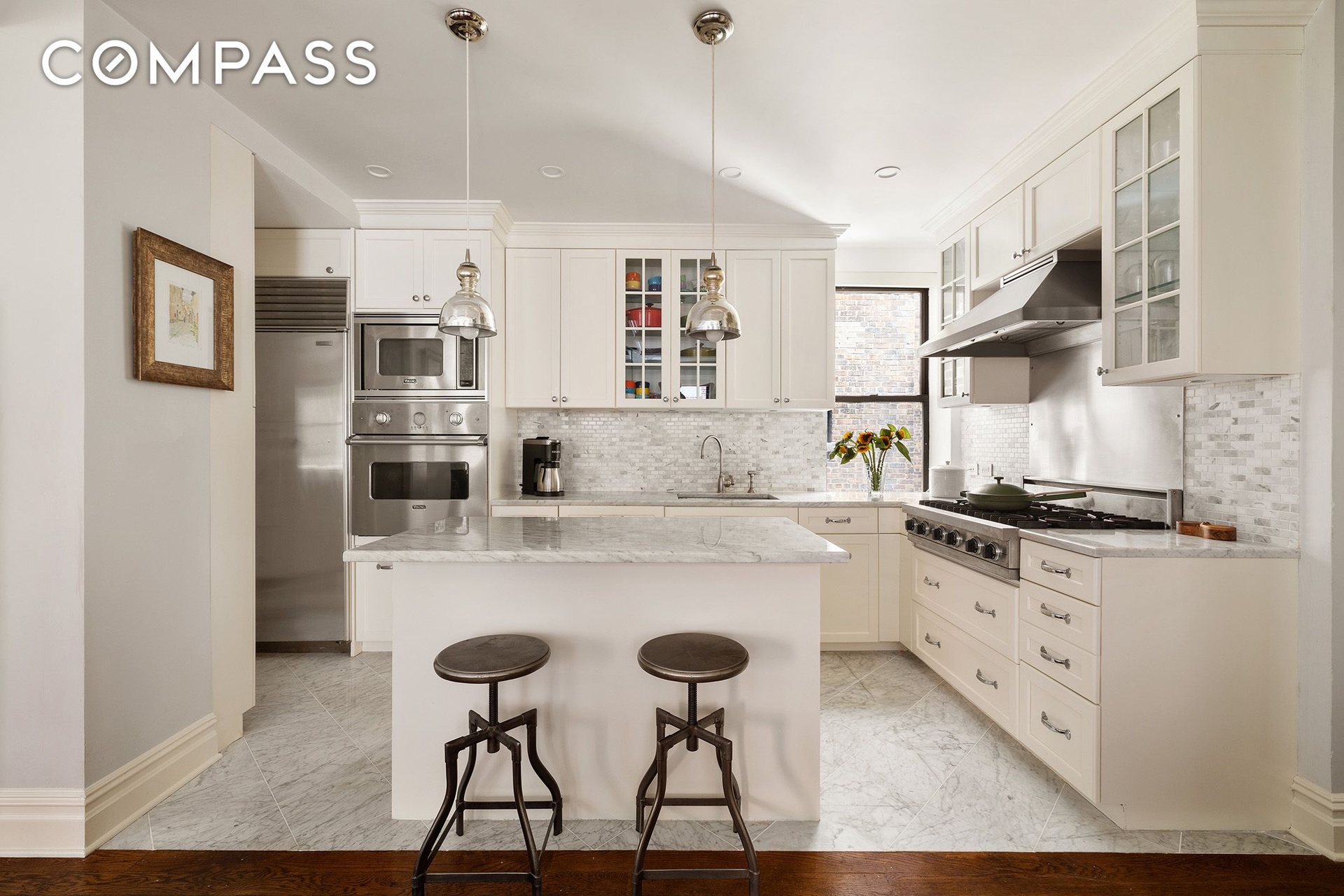 The renovated open kitchen is outfitted with custom wood cabinetry, marble countertops, an island with bar seating, and top-tier appliances including a Viking range, Sub-Zero fridge, and Miele dishwasher. A walk-in pantry and in-unit washer/dryer add convenience.