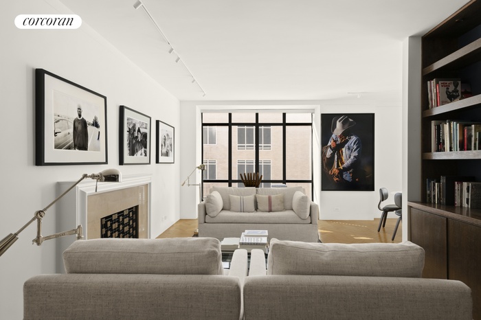 Loaded with design cred, Apartment 7F at 24 West 55th Street in the landmarked Rockefeller Apartments is a sophisticated one bedroom beauty. With stylish contemporary notes, this renovated property enjoys full Southwestern light with views onto the building's legendary garden oasis, designed in the style of the nearby Museum of Modern Art sculpture courtyard. The living room is right-sized for entertaining with brand new floor-to-ceiling double glazed casement windows, custom dark wood built-in console with hard wired pin lighting and display shelving, decorative bolection fireplace mantle with Crema marble facing, and wooden venetian blinds in the original Bauhaus style. The Dining L allows for comfortable seating with a Western-facing window and bright light. Adjacent is the all-work, no-fuss windowed kitchen fitted in handsome stainless steel countertops and white utility cabinetry with two closets for utility and kitchen supplies. The appliance package is all-Miele, including a four-burner cooktop, full-sized oven and dishwasher. The double refrigerator drawers are Signature with smart diagnostics.