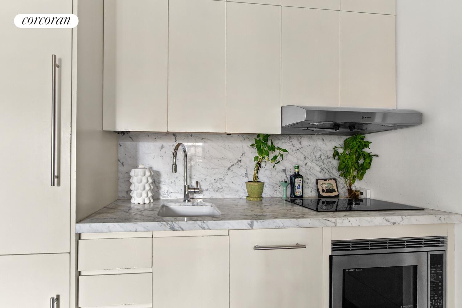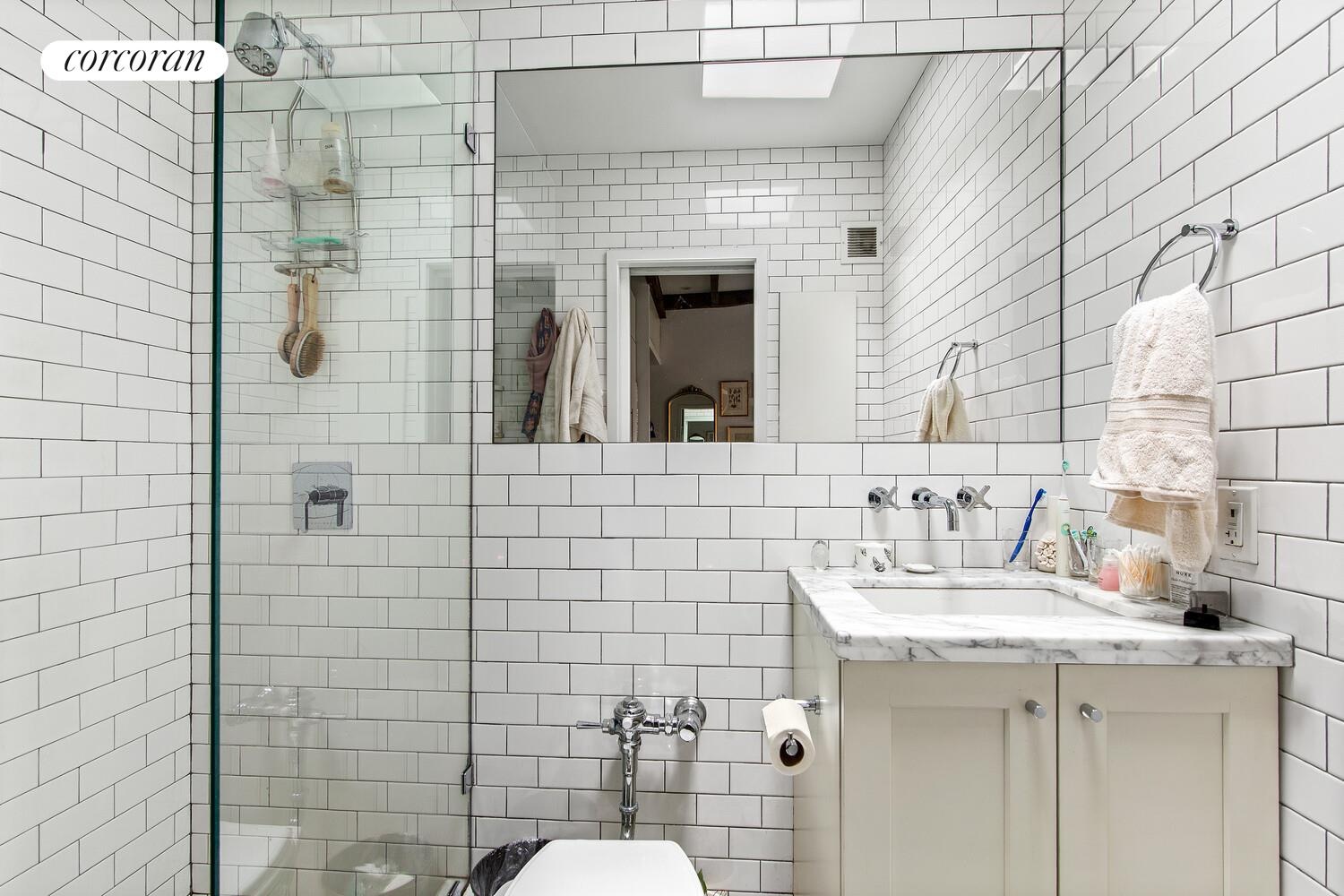 Inside, you'll discover custom renovations that include a kitchen equipped with top of the line appliances, including dishwasher. The living area features a beautifully crafted sliding barn door, which seamlessly separates the bedroom. The bedroom boasts custom-built closets and storage, allowing for a queen-sized bed. The marble bathroom features a skylight and elevated finishes.