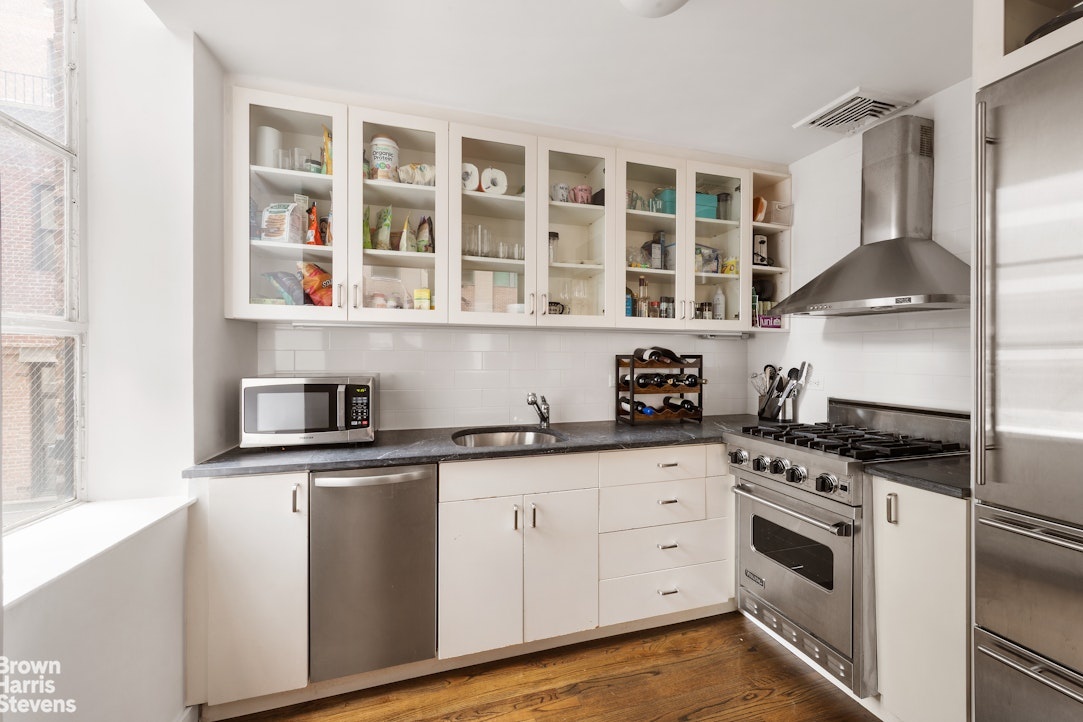 Additional highlights include recently refinished espresso-stained hardwood floors, a central HVAC system and installed custom window treatments with dual-function blackout shades in the bedroom. Monthly maintenance includes complimentary shared storage on every floor as well as gas & water.