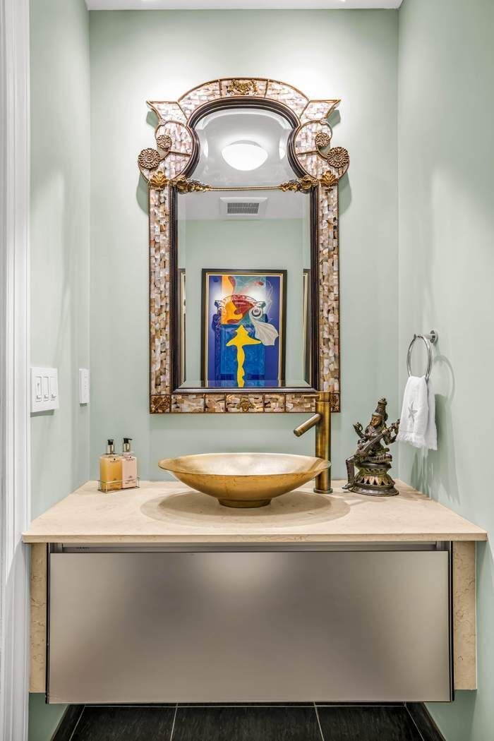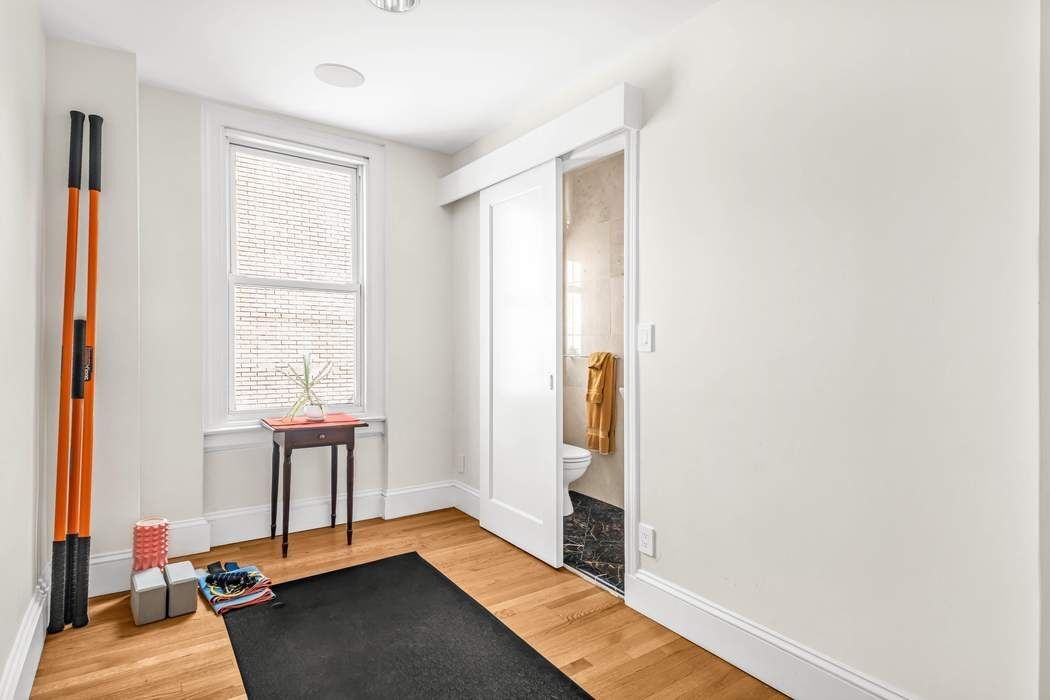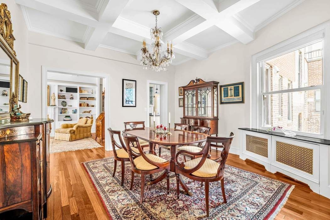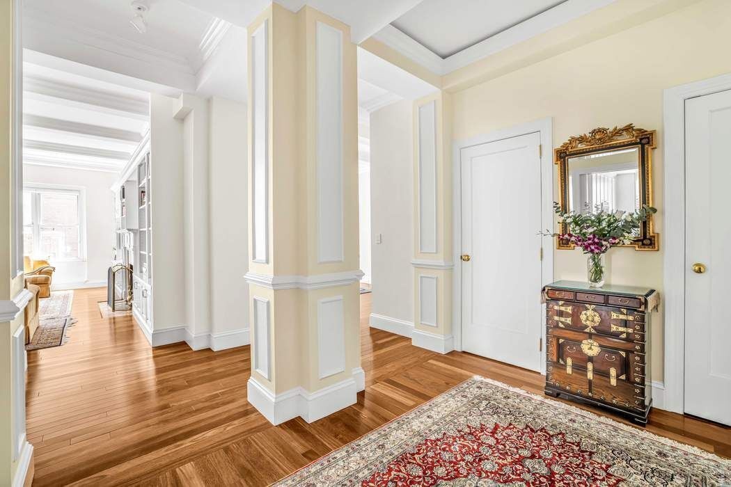 The Foyer features elegant Wall Paneling, refined Crown Moldings, and masterful Coffered-Beamed Ceilings that highlight the home’s prewar character. Brazilian chestnut floors, installed with soundproofing for quiet elegance, flow throughout the residence and lead into the grand layout. Just off the Foyer, a beautifully appointed Powder Room completes the introduction.