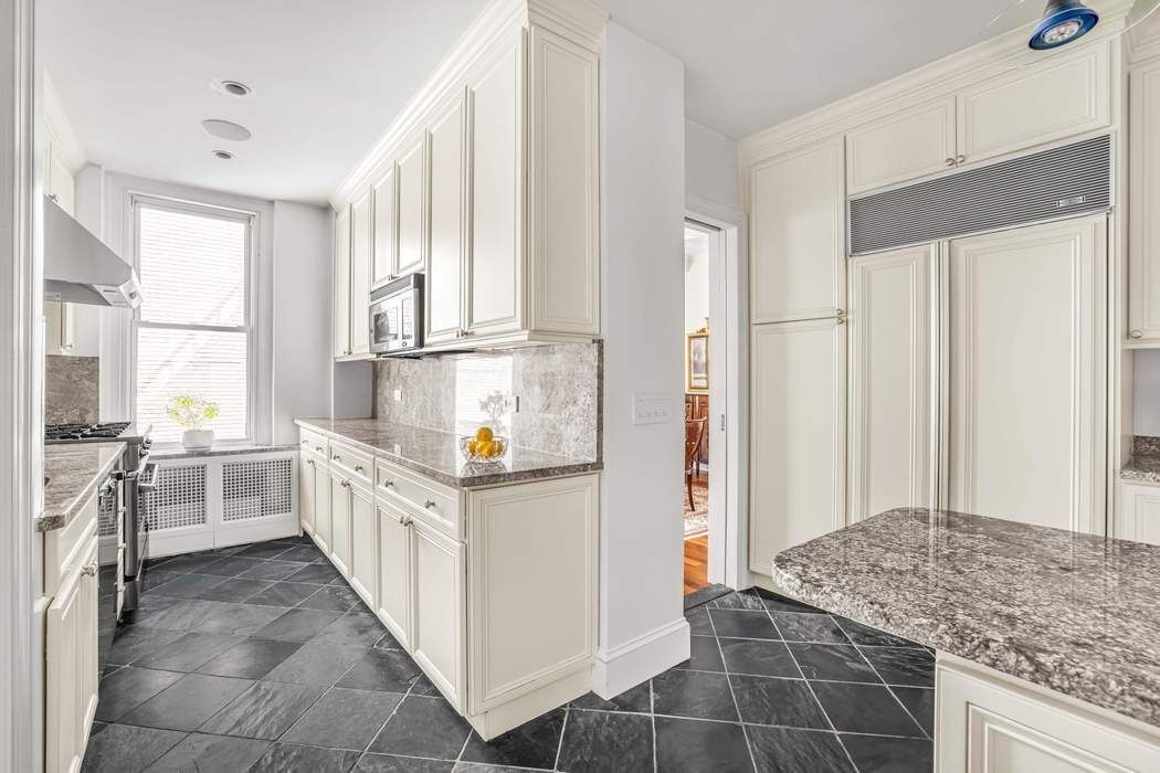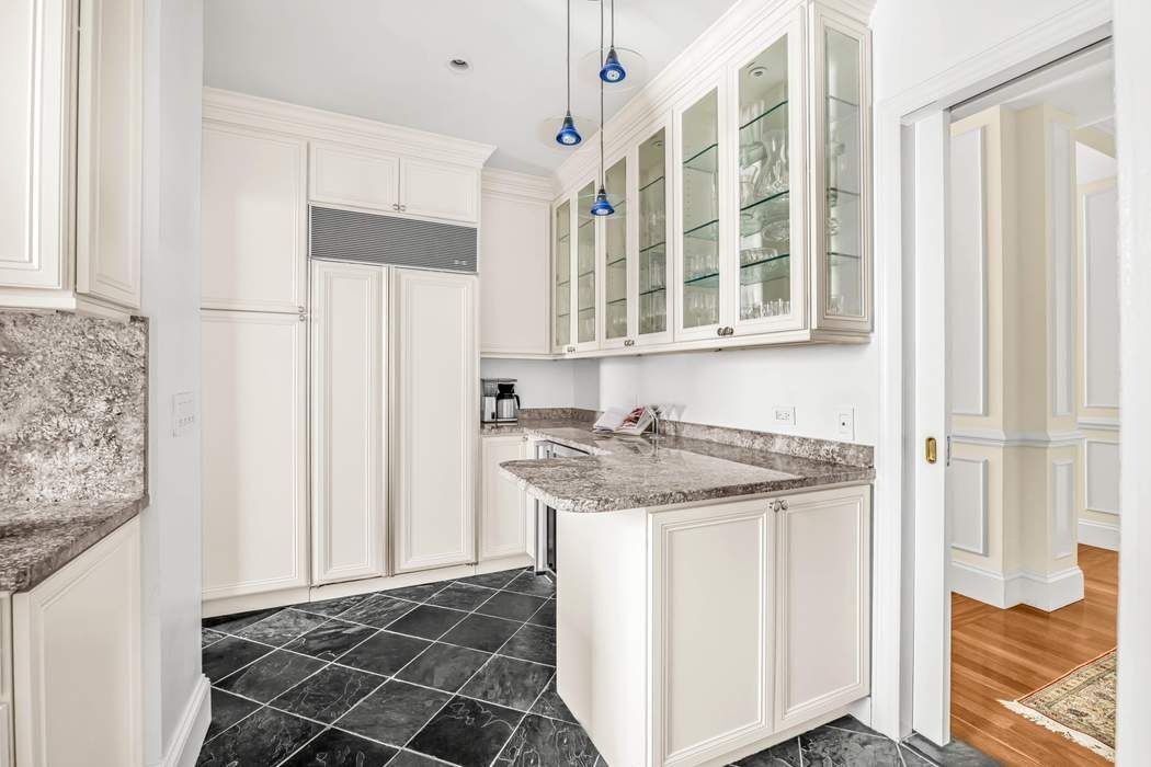 Additional Bathrooms are finished with Port Laurent, Crème Fedora, and Jerusalem Gold marbles, each contributing its own distinct personality yet unified by a consistent level of refinement. At the heart of the home, the Kitchen and adjoining Pantry blends form and function. Silver-blue slate floors ground the space, while Azul Aran granite countertops and custom cabinetry frame a suite of high-end appliances, including: a Six-Burner Garland Range and Oven with vented Hood, Subzero Refrigerator, and Miele Dishwasher. The Windowed Kitchen reflects the same craftsmanship found throughout the home.