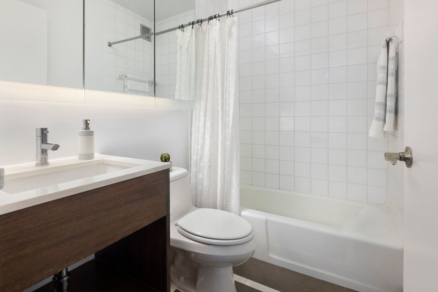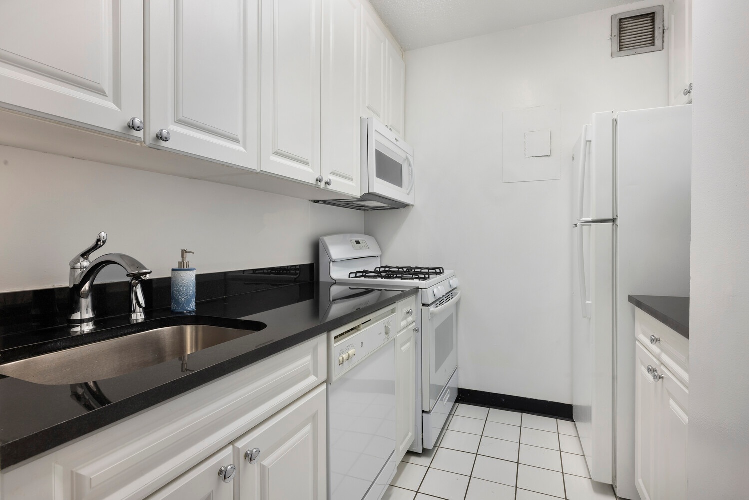 Spacious bright North-facing one-bedroom, one-bathroom apartment in a luxury full-service building located in Midtown West. Features a huge bedroom, an open kitchen with a breakfast bar, sparkling white cabinetry, sleek white tiled bath and generous closet space