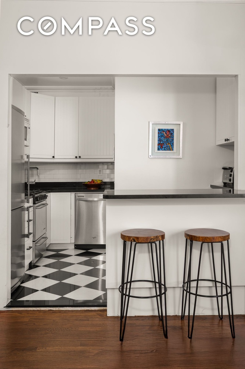 The sunlit living room offers 10-foot ceilings, refinished hardwood floors, and a south-facing oversized window with tranquil brownstone backyard views. A decorative fireplace with custom bookshelves creates a warm focal point for gatherings. The renovated open kitchen is spacious and inviting, boasting granite countertops, stainless steel appliances, and a breakfast bar that flows effortlessly into the living area—perfect for entertaining or casual dining.