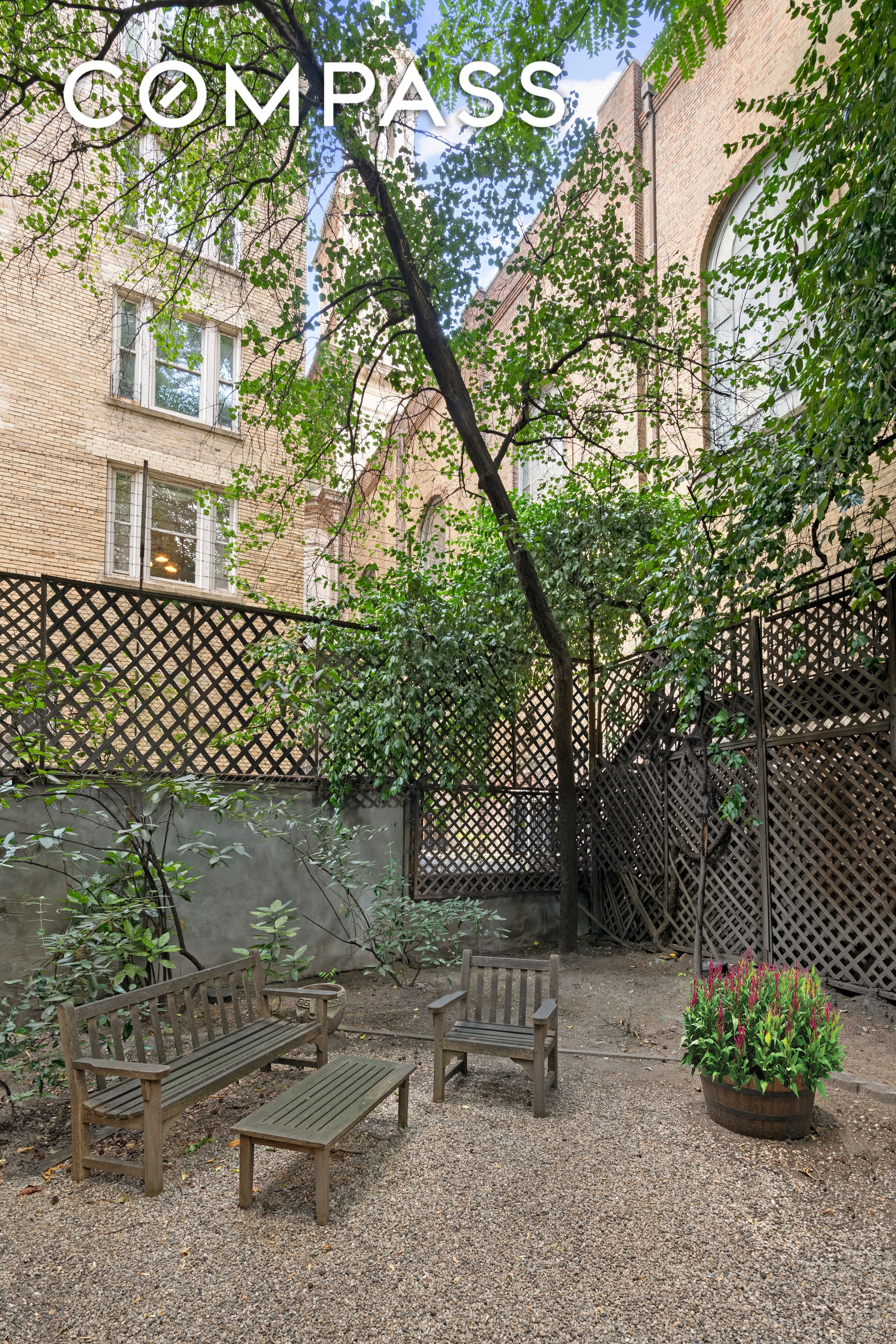 At the rear of the home, two tranquil bedrooms overlook a beautifully landscaped resident garden and a charming historic brick building with arched windows — a serene backdrop rare in Manhattan living. The spa-quality bath features a jacuzzi tub, separate shower, and sophisticated finishes.