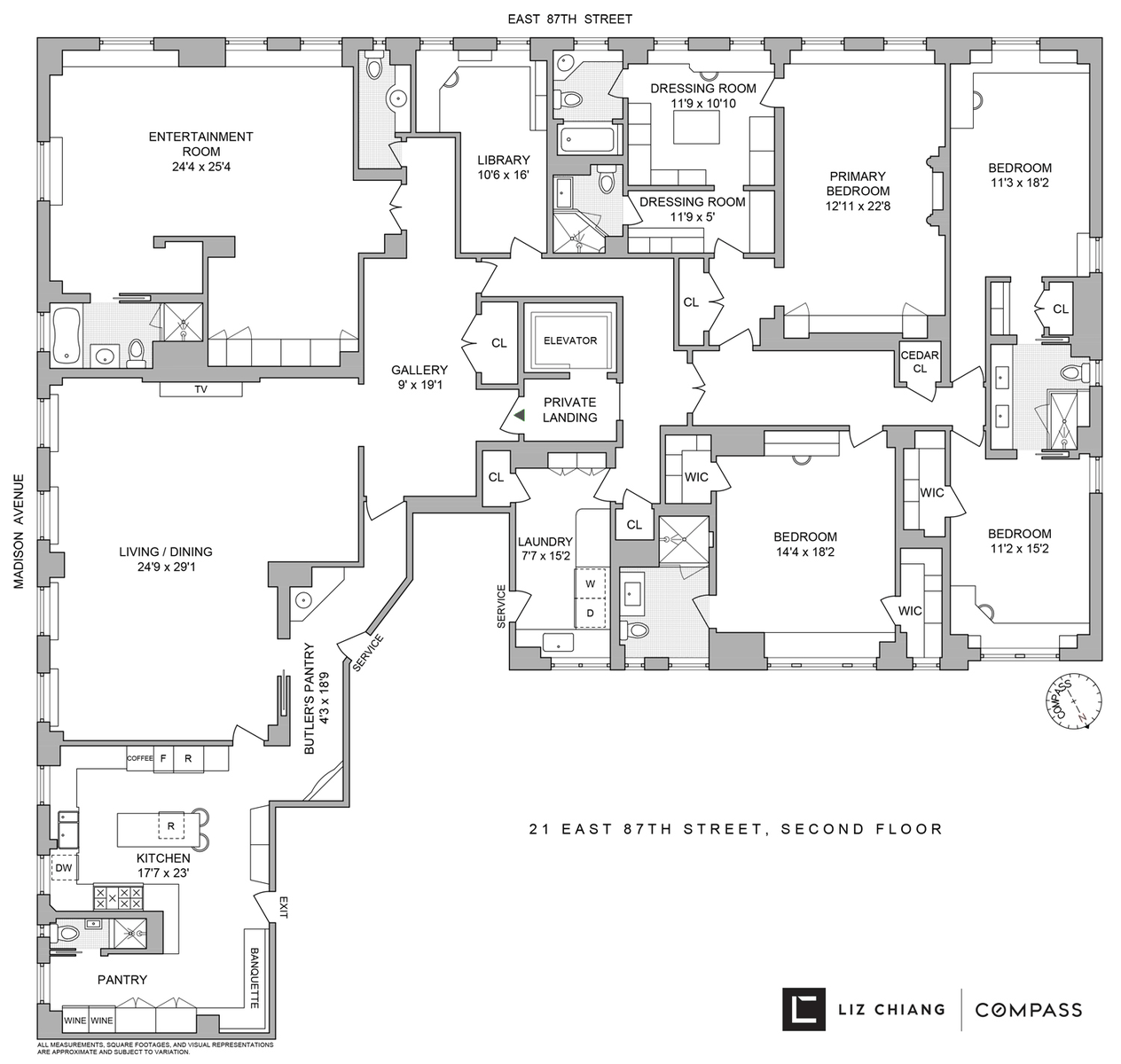 The separate bedroom wing consists of 4 generously-proportioned bedrooms located on the other side of the apartment, allowing for maximum privacy. The oversized Primary Bedroom Suite features two large dressing rooms, two en-suite bathrooms, and a decorative marble fireplace. The other three bedrooms are all spacious with walk-in-closets and en-suite bathrooms. In addition, there is a sun-filled Library (also convertible into an extra bedroom) and a large Laundry Room with a sink and full-size washer and vented dryer.