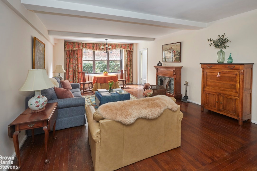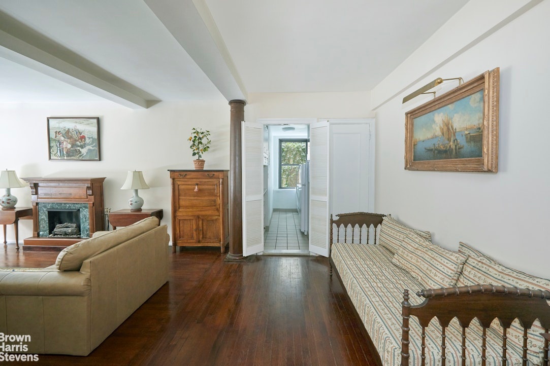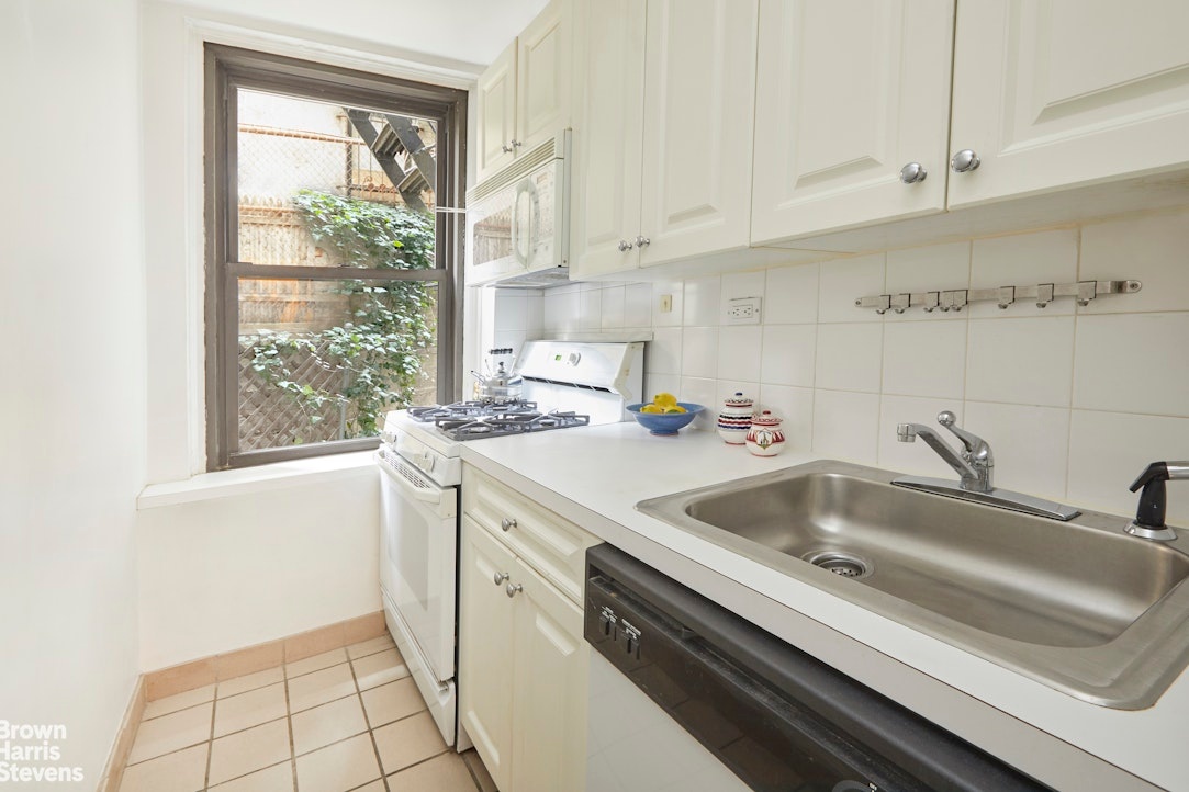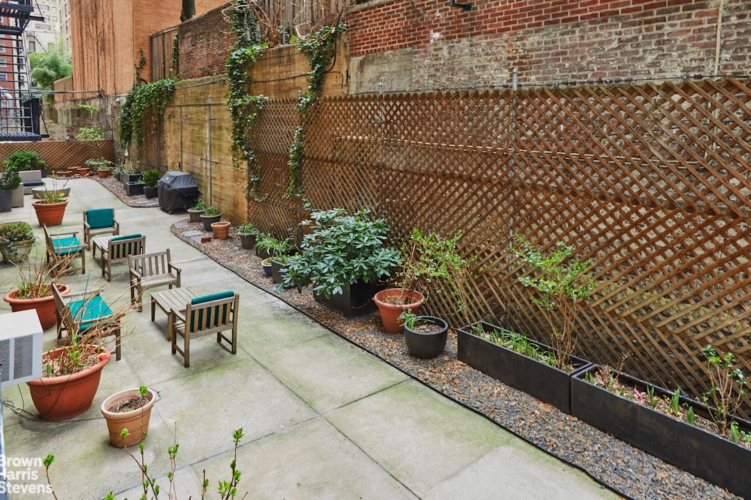 Townhouse living in a pre-war building. Welcome to apartment 1E, a lovely, quiet high first floor apartment overlooking a beautifully planted garden. This apartment has the unique convenience of being on the lobby level and one flight above the street. Windows are at second floor level.