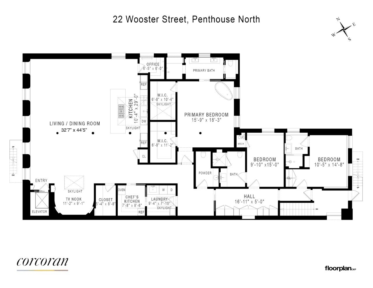 Enter directly via a key-locked elevator, this gut-renovated unit boasts approximately 3,400sf of living space with 3 exposures (north, east, and west), 14 new windows, and 5 skylights, providing ample light throughout the day. With 45" of frontage on one of the most storied cobblestone streets of SoHo, soaring 11" ceilings, and exposed beams and columns, the great room provides an incredible backdrop for living, dining, and entertaining.