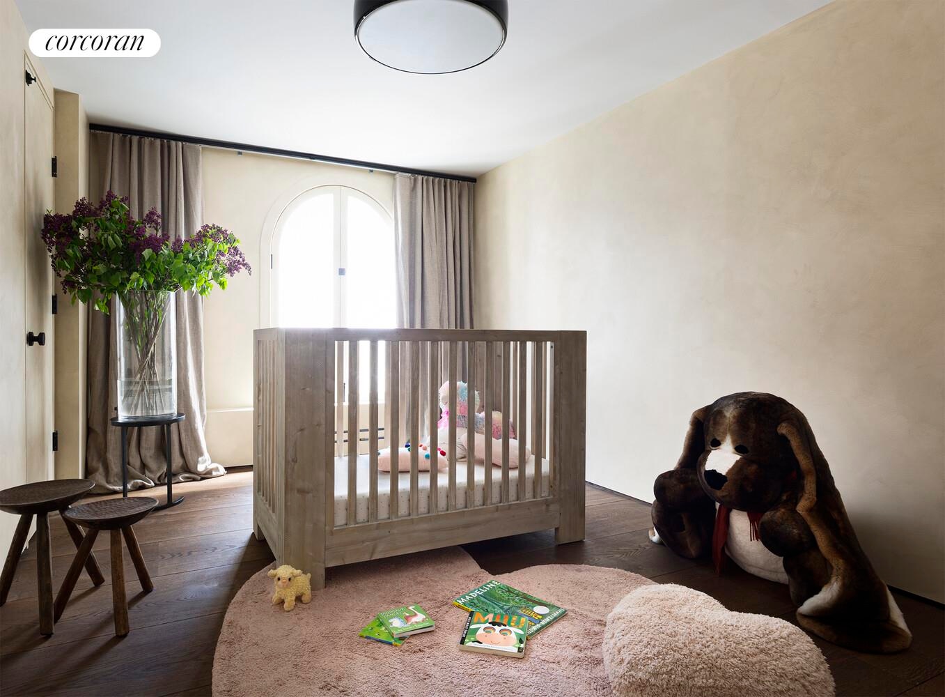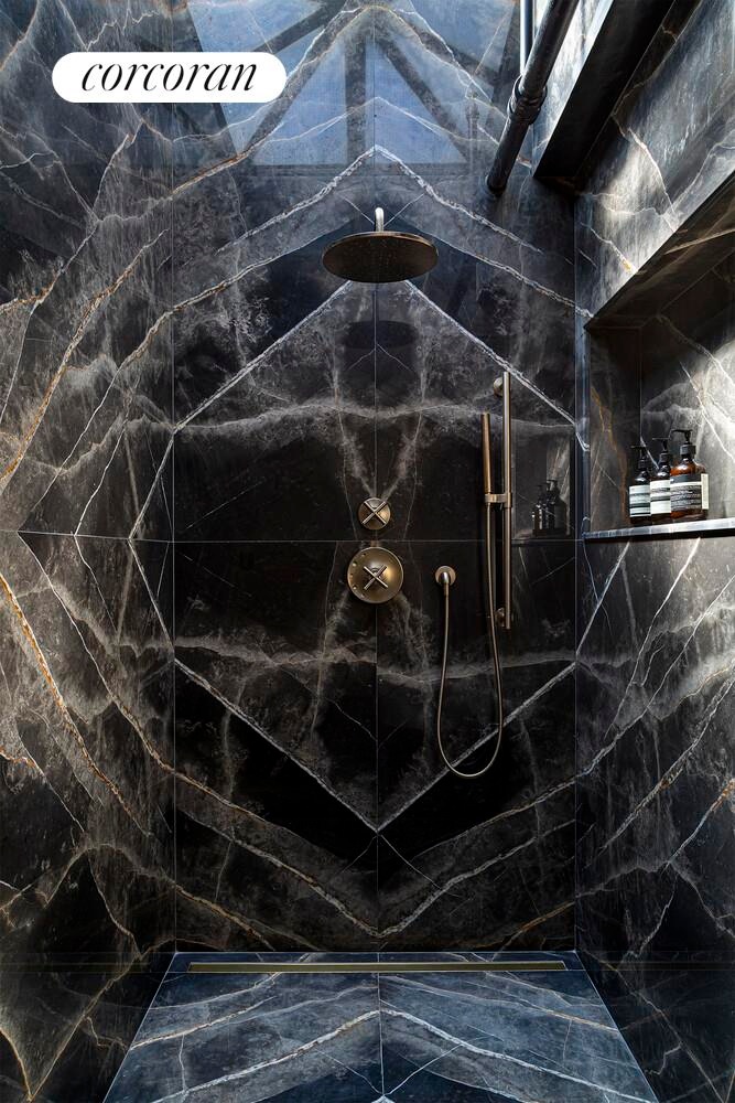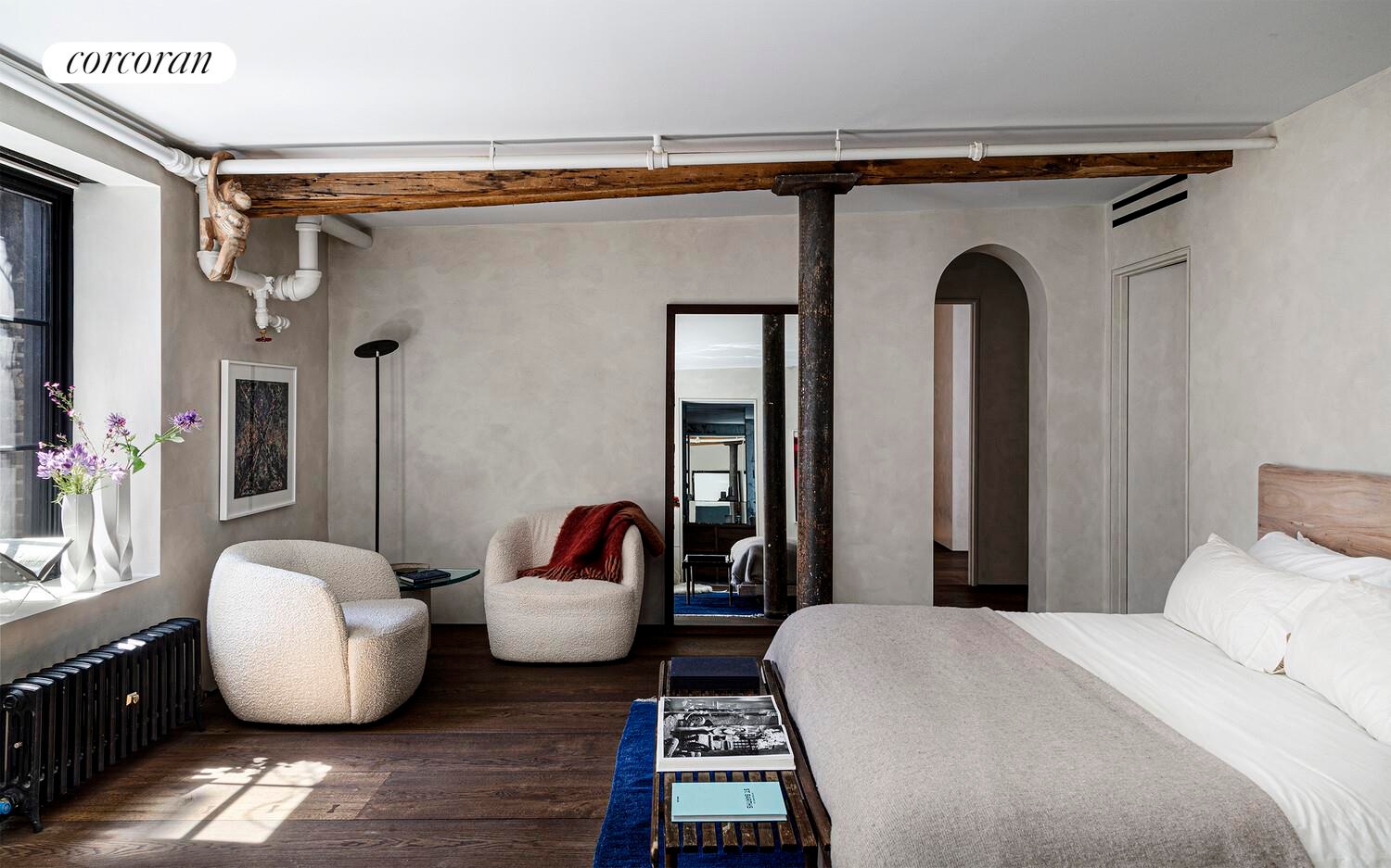 This loft underwent a two-year, multi-million-dollar gut renovation that finished in Fall 2021 with the finest materials and craftsmanship. The floors: 16-inch wide (450mm) Dinesen Heart Oak planks, imported from Denmark, with some planks reaching as long as 20 feet long. All stone used in the loft is slab imported from Italy - not a single tile used, even in the laundry room. The custom Venetian plasterwork was created by artist Benjamin Lai. From the floating art walls to the brushed bronze Forbes and Lomax switches, which are individually engraved, attention to detail is rarely seen in any property. The rounded alcove off the great room, currently set up as a TV nook, provides a natural area for a future stair to the roof if private outdoor space is desired (roof rights would need to be purchased from the building by separate agreement).