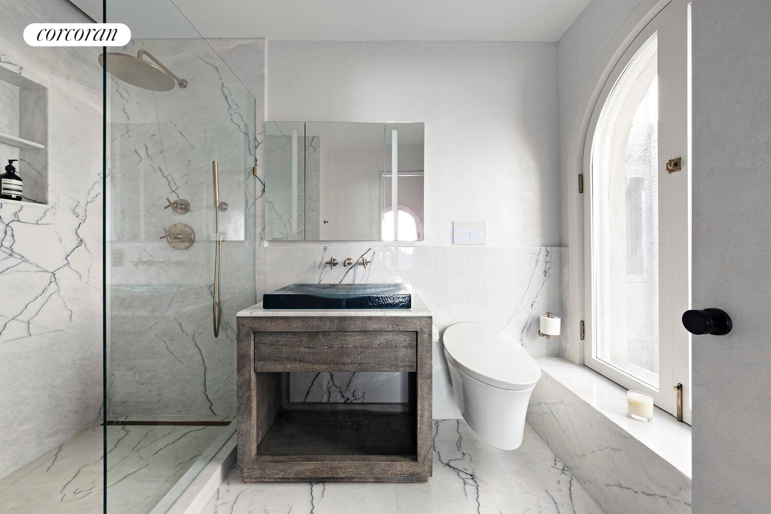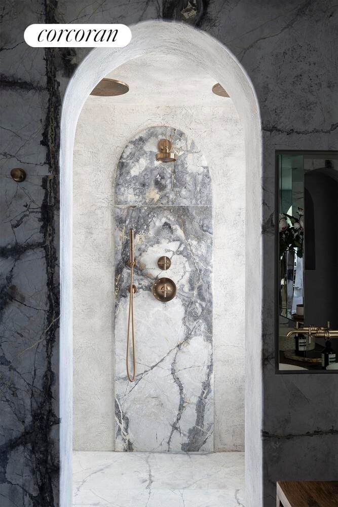 Down a wide hallway, the middle of the loft is dedicated to the primary suite. Two Eastern windows provide great morning light, while the dual walk-in closets (one that spans 18" tall) are all outfitted by Ornare with custom metal and glass shelving and integrated lighting. A freestanding clawfoot tub with brushed bronze feet sits elegantly in the corner. The primary bathroom, with radiant heat floors, invisible grey marble floors and walls, and an intelligent toilet, is a perfect proportion. The 96" custom oak vanity with Dual marble Kensho sinks provides ample storage, in addition to recessed medicine cabinets, and LED lighting, providing a calming, almost zen-like bathroom. The massive shower, with a large window and bench, has dual rain showerheads in brushed bronze.