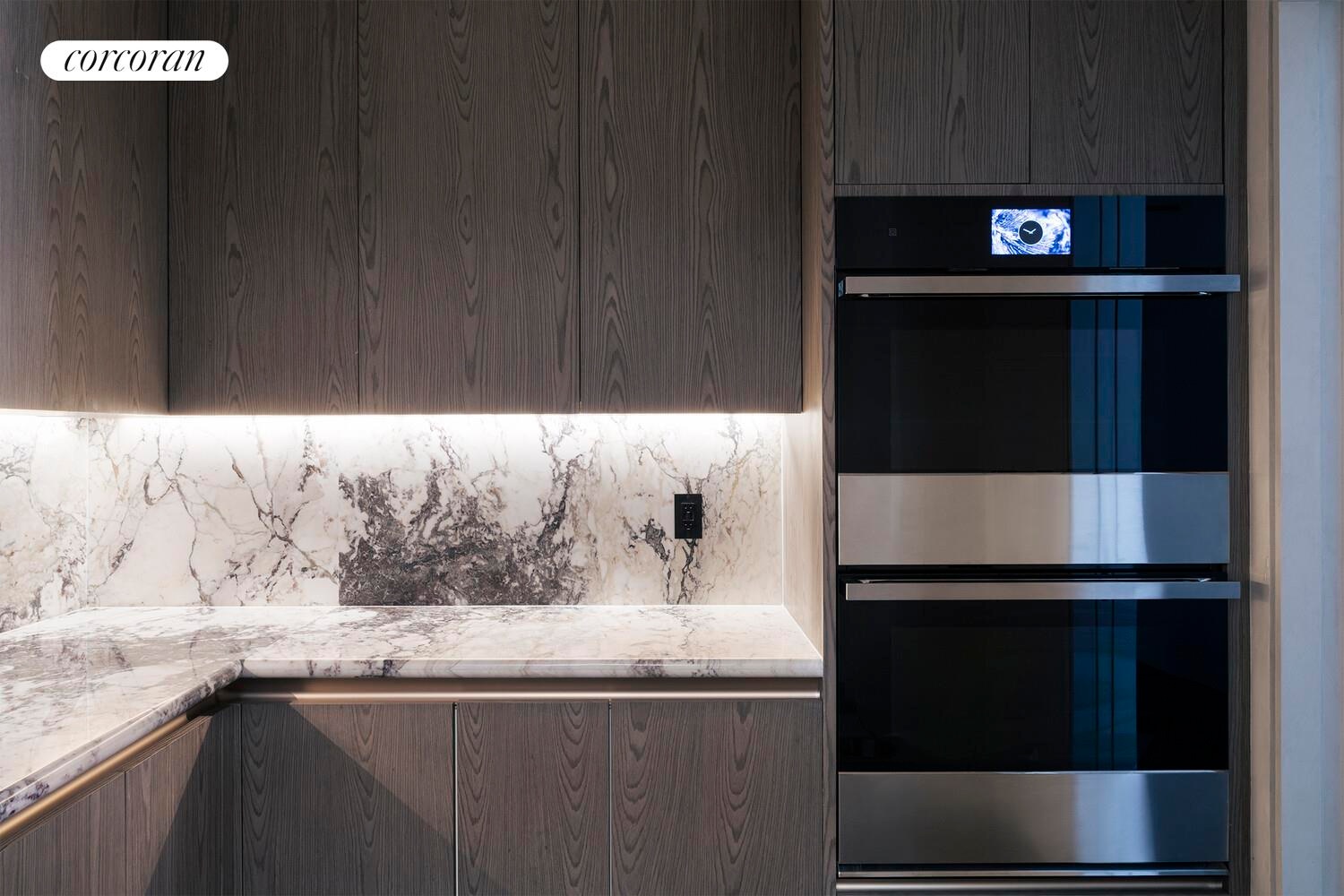 The kitchen, with millwork from Ornare, is centered below a massive skylight, and a twelve-and-a-half-foot island with seating for up to 6 creates the perfect environment to cook and entertain. A three-inch rounded Calcatta Paonazzo book-matched marble slab provides a modern element within the context of the space, and stone shelves with integrated lighting illuminate the show kitchen, along with double fridge and double columns freezers. Down the hall lies a "messy" kitchen with a pocket door with dual ovens, a warming drawer, and a wine cooler.