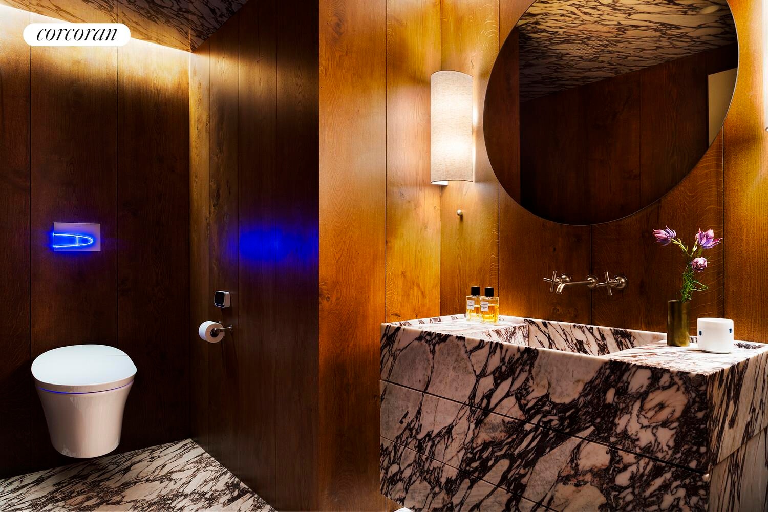 Off the great room, you have a small home office with a large beautiful arched window, perfectly hidden away, for those who wish to continue to work from home or simply have a little privacy. The masterfully designed powder room is a sight to be seen, with Calcatta Viola slabs on both the floor and ceiling, a custom marble vanity with storage, and Dinesen paneling on the walls.