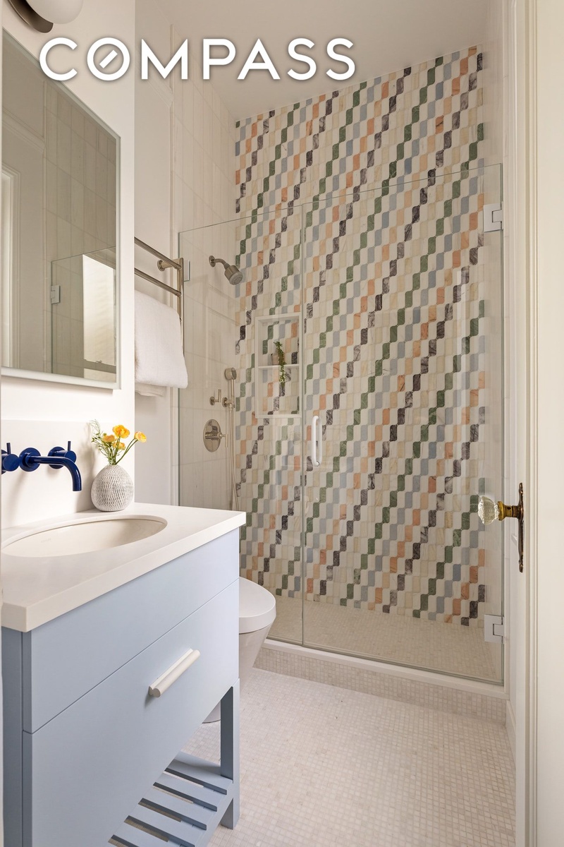 On the primary level's eastern wing, three bedrooms are tucked quietly away, and can be completely closed off from the living spaces. Facing north, each bedroom enjoys protected views of Central Park and the Museum of Natural History. The principal bedroom has large closet with custom millwork, a windowed en-suite bathroom, and easily accommodates a king-size bed. The bathroom offers a deep soaking tub, walk-in shower and brand new fixtures by Watermark. The floors are Bianco Nero stone mosaic tile, and the walls are glazed brick tile. A custom vanity with plenty of storage and radiant heated floors make this a luxurious and functional space.