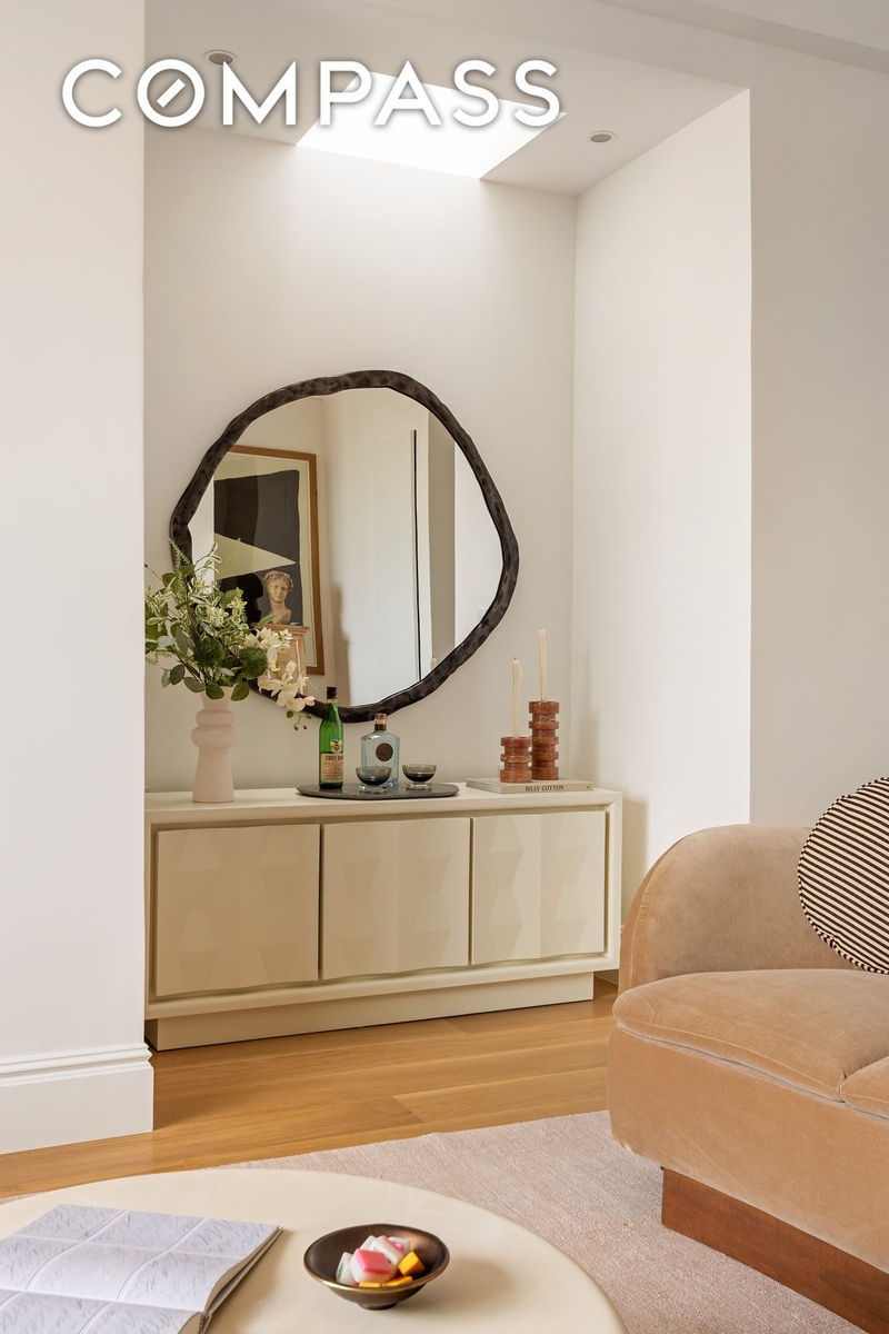From the ornate elevator landing, enter the home through the gracious reception foyer. The living and dining rooms are each separate and formal, and are as well-suited for entertaining as they are for the creature comforts of daily life. Ceiling heights of nearly 11', pristine wide-plank White Oak floors and newly skim-coated walls prevail here and imbue a sense of contemporary ease in the home's pre-war floor plan.