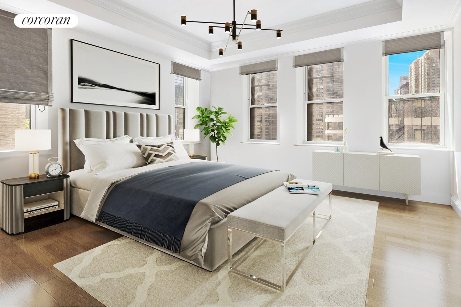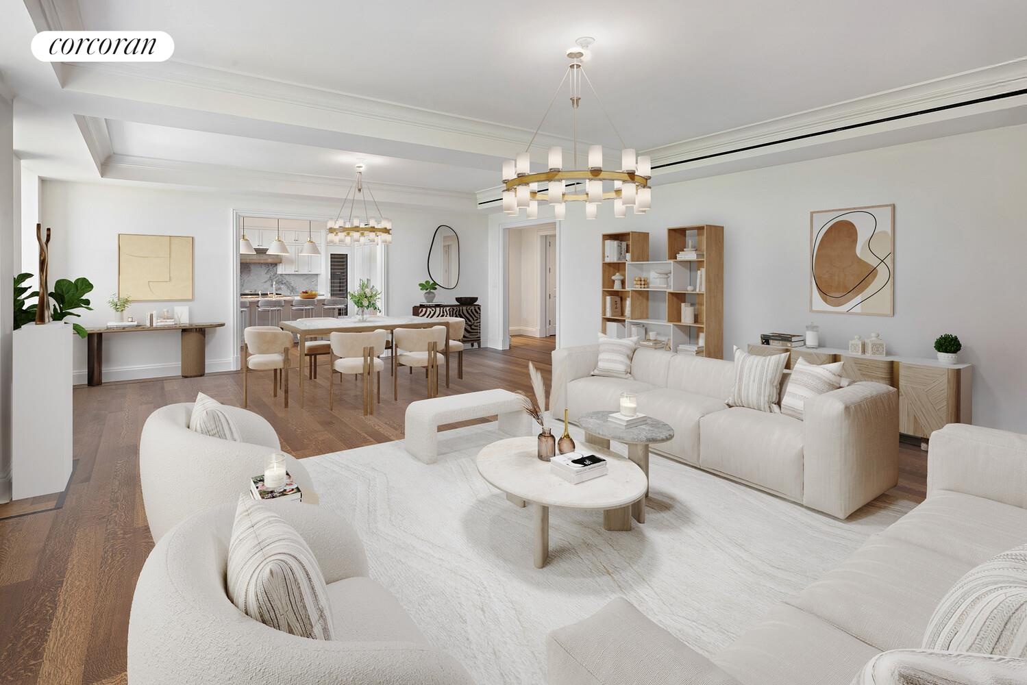 The expansive living and dining room, with coffered ceilings, is framed by windows that flood the home with natural light and capture the beauty of Riverside Park. Solid 5-inch-wide white oak floors and custom millwork throughout evoke the grandeur of another era, while the open Chef's kitchen is outfitted with Wolf & Subzero appliances, lacquered cabinetry, and pearl-gray quartzite countertops. The oversized eat in kitchen opens up to the great room.