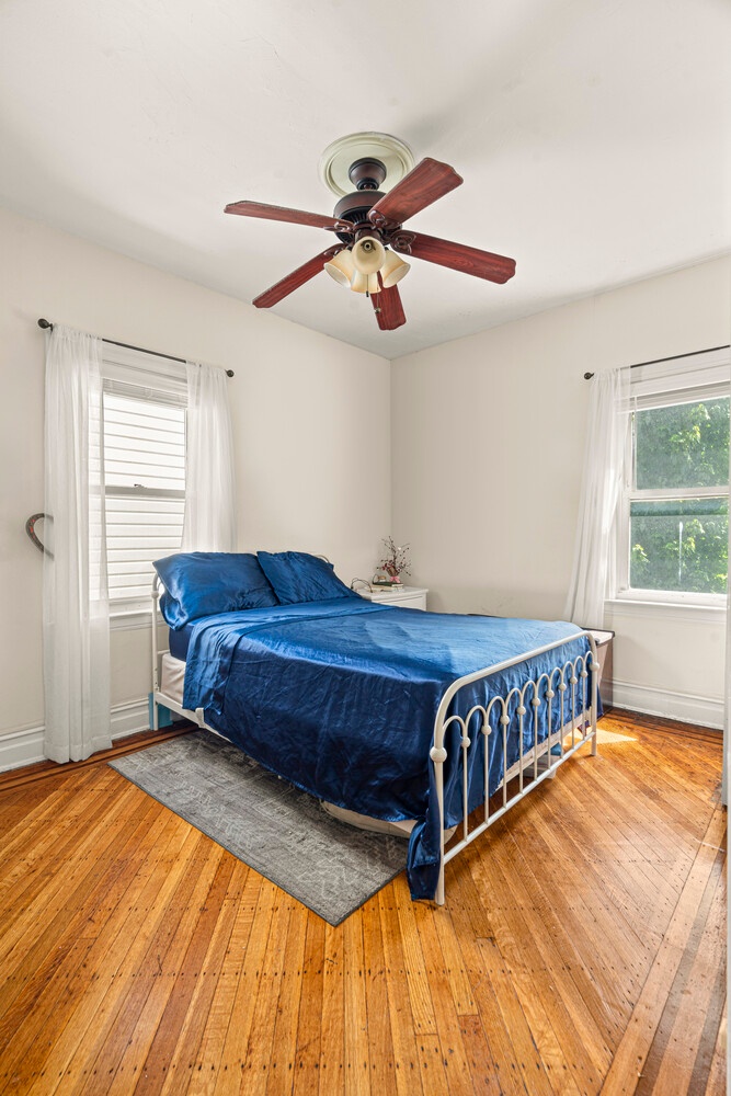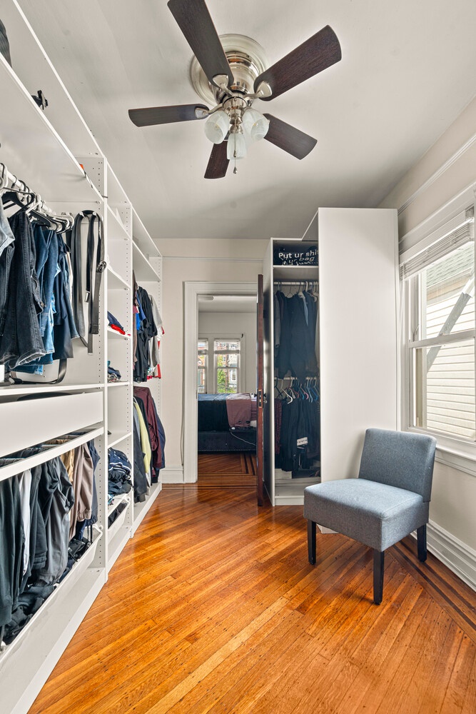 Upstairs, original hardwood floors with contrasting inlays have been meticulously preserved. The second floor features an oversized primary bedroom along with two additional bedrooms-one currently outfitted as a large walk-in closet/dressing room. An updated full bathroom sits at the end of the hallway. Throughout this level, details like the original staircase and banister add timeless charm.