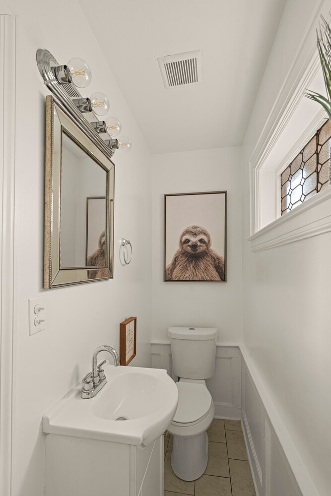 A sun-drenched, west-facing sunroom welcomes you into the home and leads to a spacious main living room adorned with stained glass windows and classic wainscoting. The formal dining room flows naturally from this space, offering a perfect setting for entertaining. At the rear of the home, the kitchen is a standout with walnut-toned cabinetry, granite countertops, and premium appliances including a Samsung range and LG ThinQ refrigerator-ideal for both serious cooks and everyday use. A tucked away powder room, with its own stained glass window, and a convenient laundry closet with full-size LG washer and dryer complete this level.