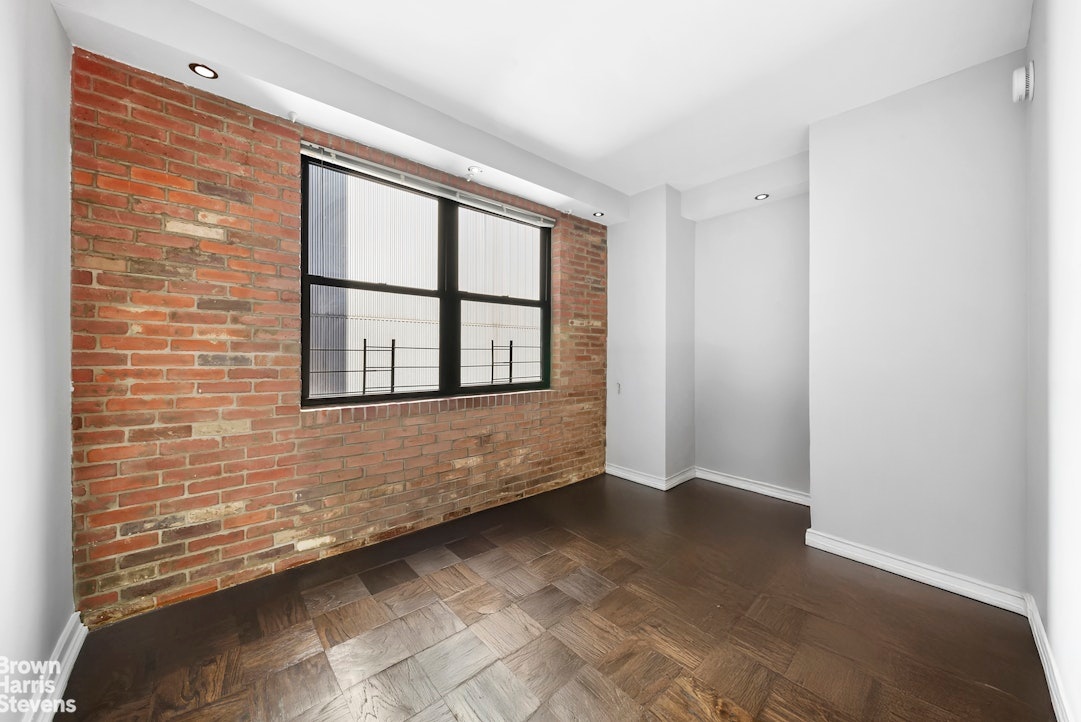The oversized primary bedroom provides ample space for a king bed, dressers, nightstands, home office and exceptional storage. The second bedroom features a distinctive brick-paneled accent wall with warm west-facing light.