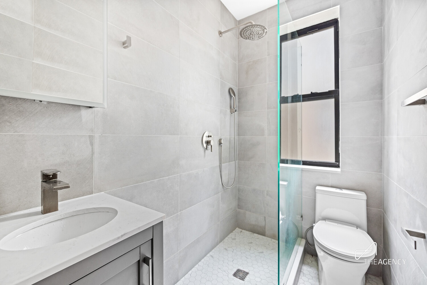 The bathroom has been fully gut-renovated with brand new floor-to-ceiling tile, a glass-enclosed shower, a sleek new vanity, and refined contemporary fixtures. A new LG washer-dryer combo completes the residence with seamless convenience.
