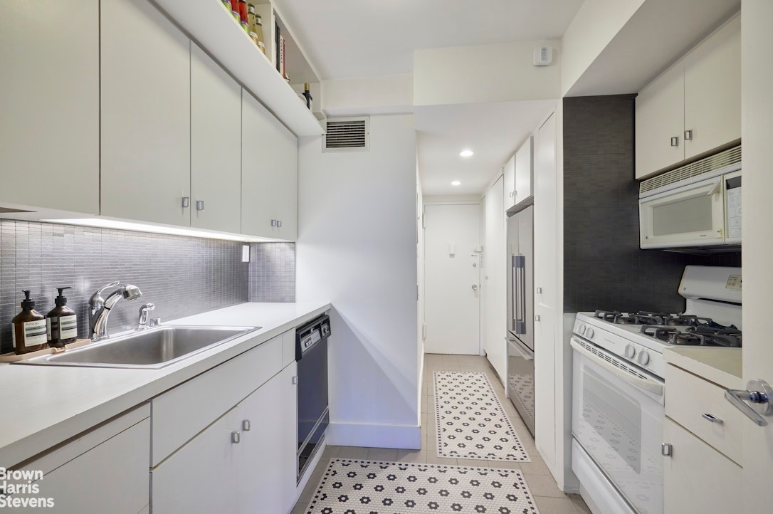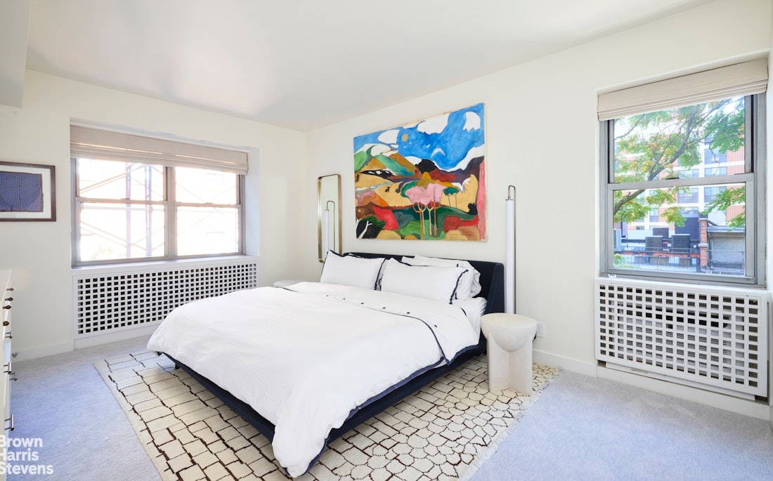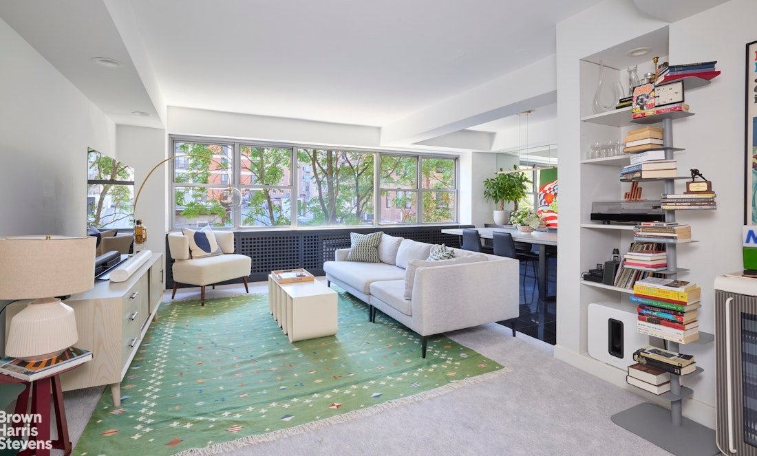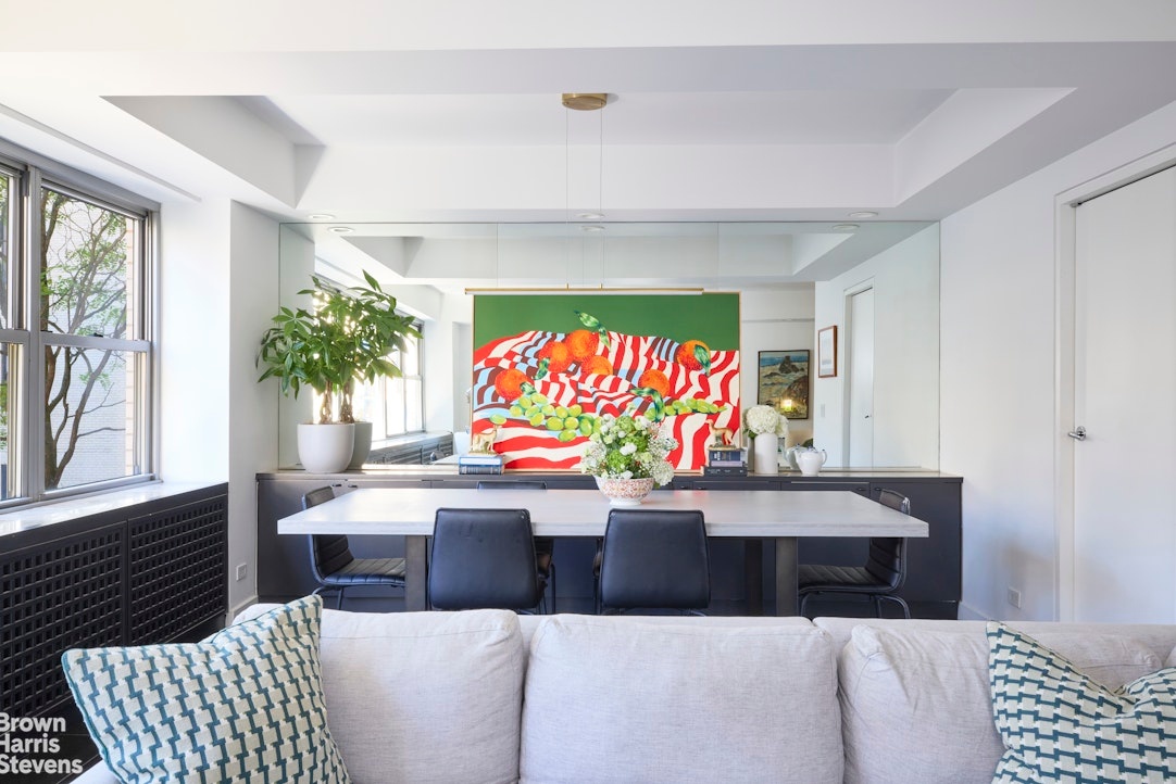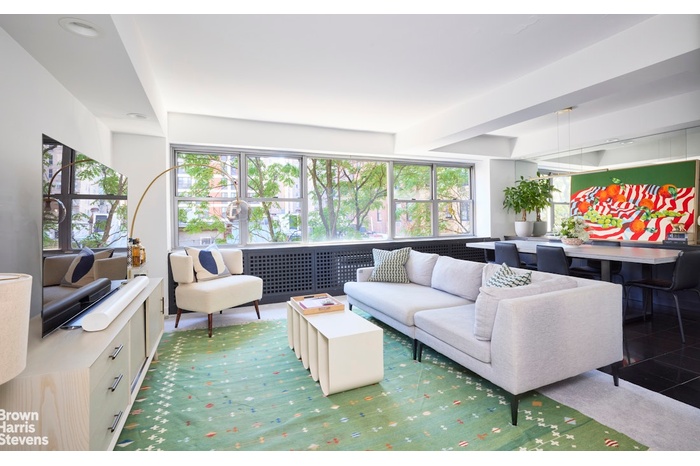 The open living room-dining layout showcases charming views of the surrounding townhouses, mature trees, and verdant gardens through oversized windows spanning 17'6" of the 21' width of the space. The delightful views are on display from the moment one enters the apartment-and NYC landmarks like The Carlyle can even be spotted sparkling at night from the living room windows. A gracious entry leads into a large open living room-dining space that can accommodate sizable gatherings while remaining intimate for cozy days and nights at home. The large kitchen, just off the dining area, is ideal for the casual or serious chef, and features a full-size luxury Fisher and Paykel fridge. The generous corner primary bedroom has dual exposure windows with fantastic townhouse/garden/tree views in both directions. It features a full wall of closets, an additional large