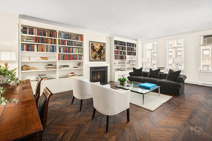 The grand living room, distinguished by a wall of the building's signature casement windows and a wood-burning fireplace, is bathed in sunlight and ideal for both entertaining and quiet enjoyment. An equally spacious formal dining room adjoins, perfect for hosting in style.