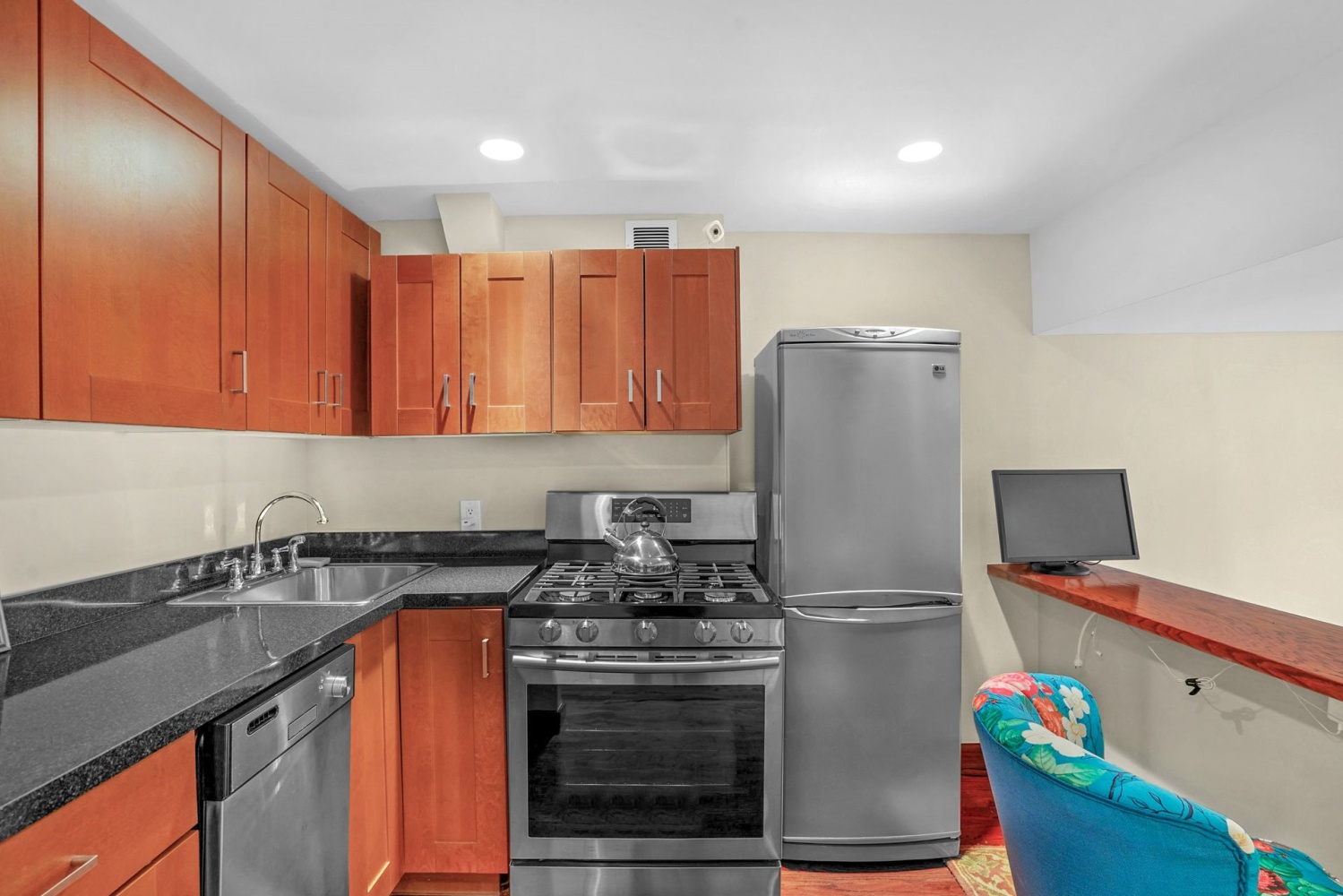 With large west-facing windows framing peaceful views, the studio is bathed in natural light throughout the day. The multi-level layout seamlessly blends comfort and functionality. The kitchen, equipped with stainless steel appliances and spacious cabinetry, meets all your cooking and storage needs. High ceilings, hardwood floors, a generously sized bathroom, ample closet space, laundry on the same floor, and low monthly maintenance further enhance the apartment's appeal.