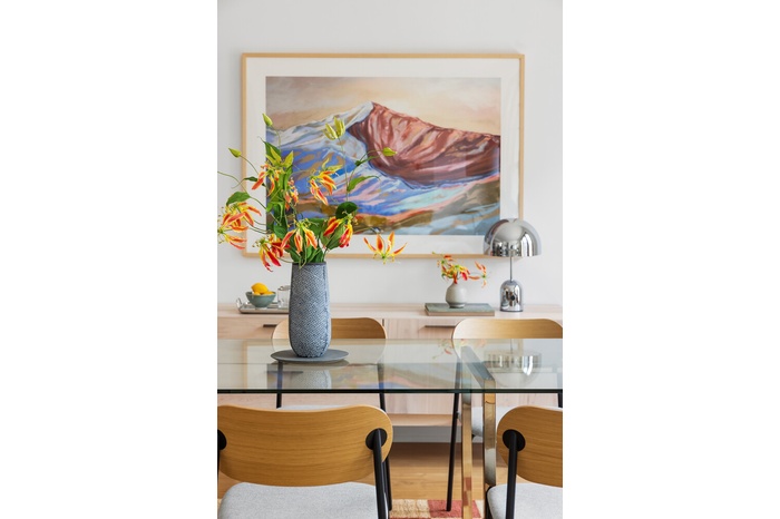 The expansive double-wide living and dining room features 10.5-foot ceilings and an oversized, wood framed wall of windows facing south. Wide plank, hand-laid oak hardwood flooring and restored, low-profile cast iron radiators designed with charming turn-of-the-century detail complement the space.