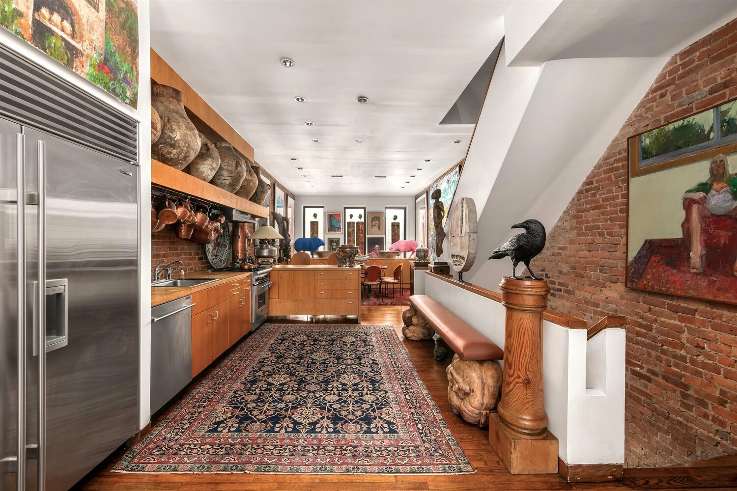 With more than 6,600 square feet of interior living space, the home also features 1,200+ sq. ft. of outdoor space including a peaceful south-facing garden patio, an expansive roof deck with panoramic neighborhood views, and a balcony overlooking the garden. Inside, soaring 10-12 ft. ceilings, skylights, double-height spaces, and abundant windows fill the interiors with natural light, creating a refined, gallery-like atmosphere. Hardwood floors, exposed brick, recessed lighting, and oversized windows set the stage for an inspiring and creative lifestyle. A dramatic solarium-style living room overlooks the garden and features built-in storage and speakers, perfect for both entertaining and relaxing.