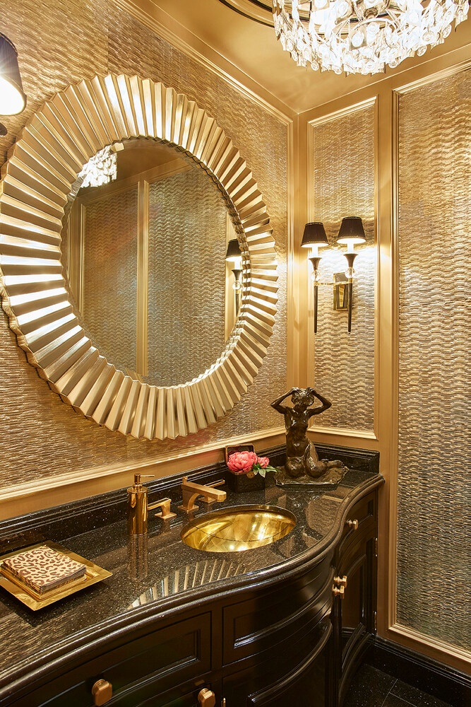 Enter into a spectacular foyer and entry gallery with a grand central stair with brass and iron balustrade and, marble floors which lead to a guest powder room and the formal dining room. The adjacent chef's kitchen is outfitted with appliances worthy of a fine restaurant, including an eight-burner Viking range, multiple ovens, dual Sub-Zero refrigerators, and two Bosch dishwashers. A pantry and breakfast bar lead to an outdoor terrace.
