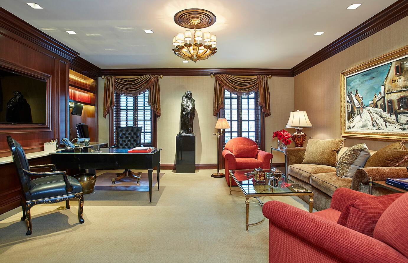 This well-designed home is served by an oversized elevator that services all seven floors including the basement with an expansive home office space, massive storage rooms, a full laundry room with a utility sink, and staff quarters. Smart home features include a top-of-the-line Crestron security system with cameras and DVR playback accessible via computer or smartphone. Heating and cooling, motorized window shades, and lighting are also controlled via video panels throughout the home and smartphone access.