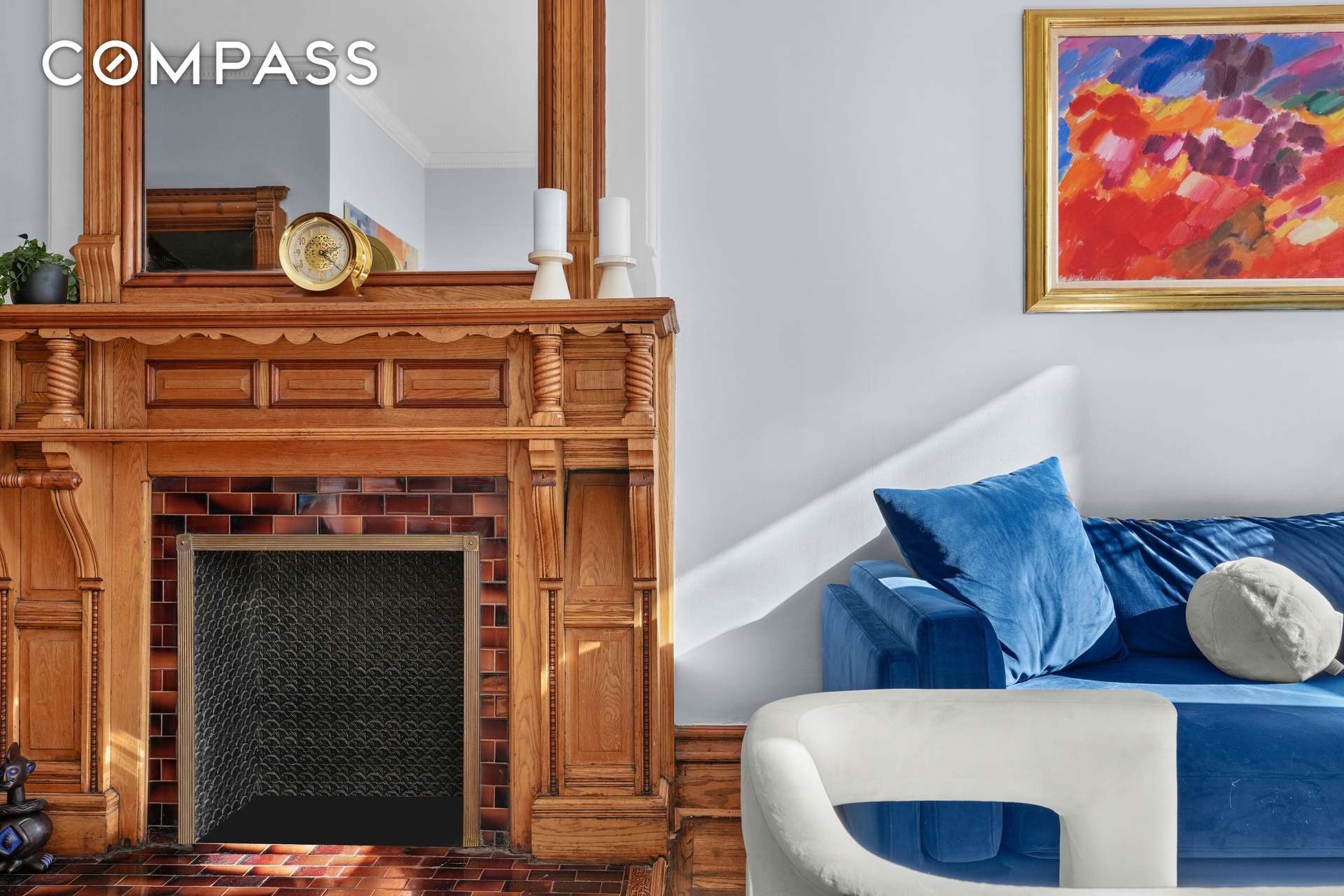 On the third floor, you'll find the South-facing grand primary bedroom with triple windows and a dedicated sitting area, enhanced by a cozy decorative fireplace that adds warmth and charm. The room is complemented by large, open closets, offering both functionality and style. Also on this floor is an updated bathroom, complete with a modern shower and a sleek sink. The spacious second bedroom on this floor can function as a children’s room, guest bedroom or a productive home office.