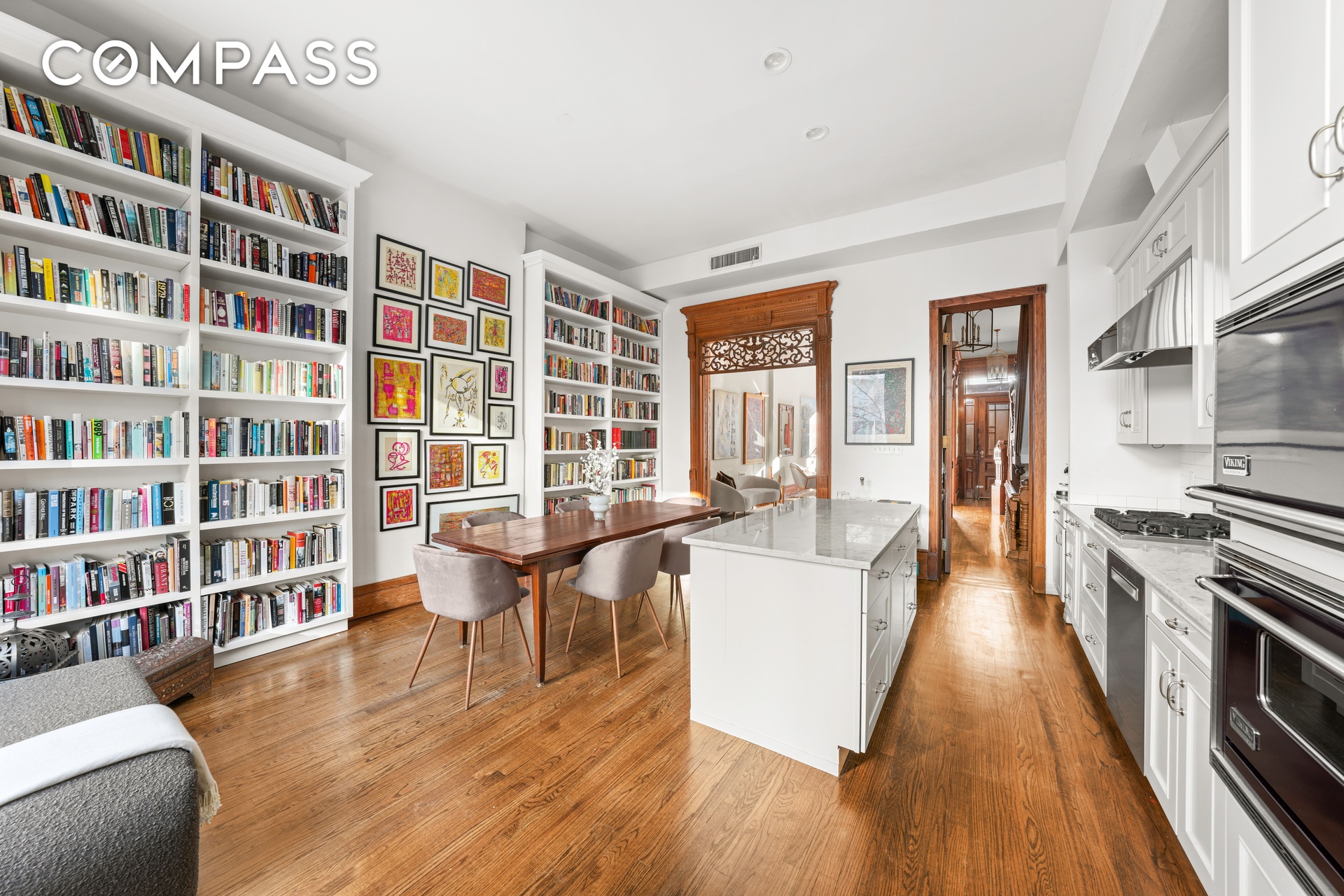 As you enter through the grand front doors, you are welcomed by the refined elegance of the home. The living room boasts soaring, high ceilings and well-preserved original details, creating an ambiance reminiscent of an art gallery. Two spacious sitting areas are perfect for hosting dinner parties. The living room seamlessly flows into a renovated chef’s kitchen, equipped with stainless steel Viking and Bosch appliances, ample storage, and a new security storm door that leads to a deck with direct access to the backyard. An oversized window in the kitchen allows for tons of light and creates a perfect and serene picture of the garden.