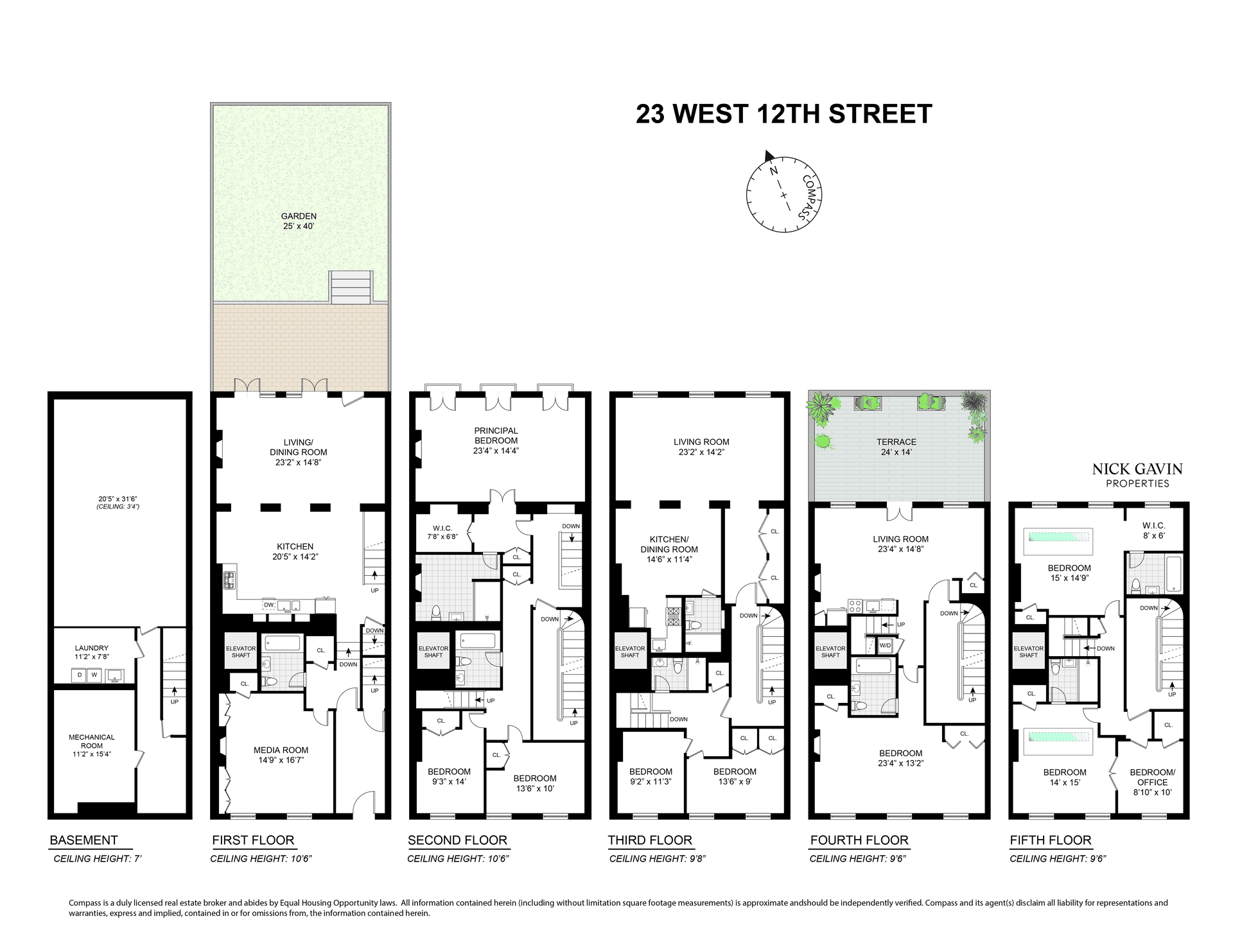 Stretching five capacious floors, 23 West 12th Street is a canvas for even the grandest ambitions. There are high ceilings on every floor, up to 10.5', plus vaulted skylights on the top floor that create even more volume and abundant natural light. The home includes a lush 40-foot-deep garden, ample space for a full outdoor kitchen plus generous dining and relaxation areas. The fourth floor offers a large private terrace as a more intimate secondary outdoor space. An elevator shaft is already installed in the house, eliminating a major construction component for future buyers. There are six distinctive fireplaces throughout the house, a nod to the home's historic provenance. Finally, the basement currently offers a laundry room and huge storage capacity; it can easily be converted to a multi-functional level with a gym, wine storage, sauna, and more.