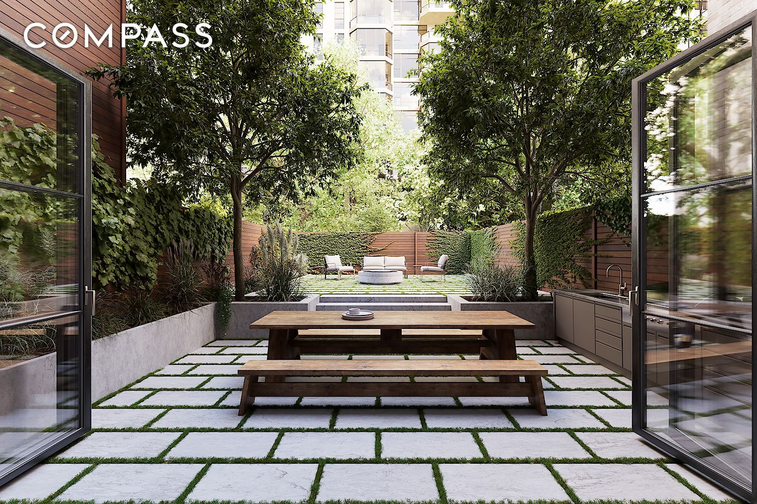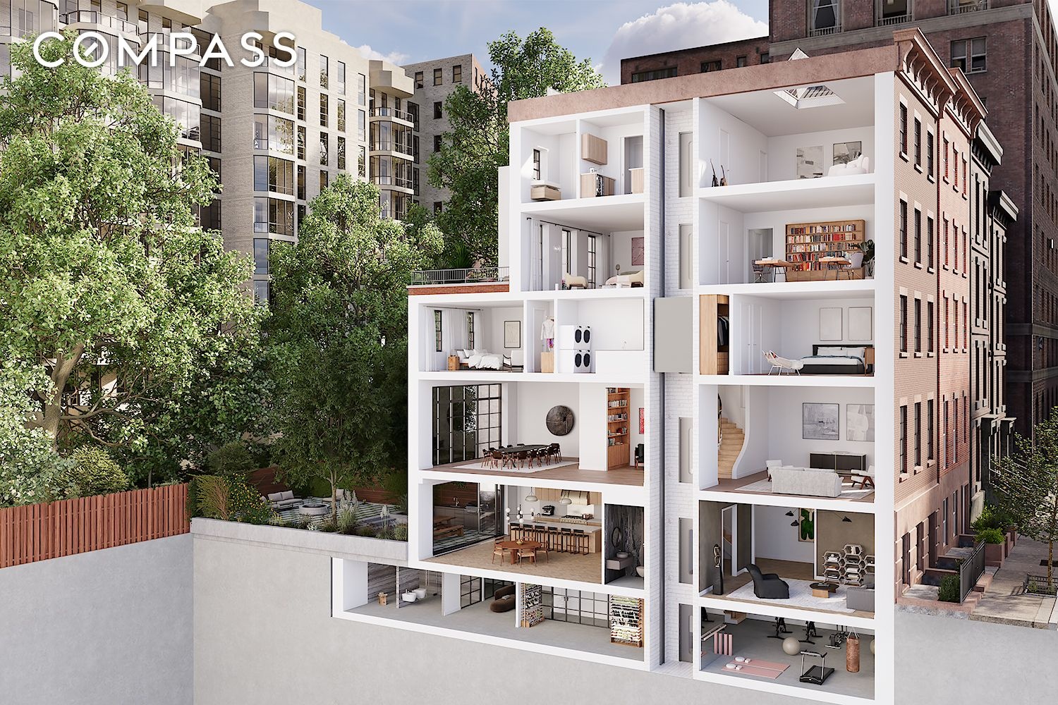 The garden level, second floor, and 1/3 of the third floor make up the 5-bedroom triplex. The heart of the triplex, the great room is a generous expanse divided by original columns. This allows natural separation between the open kitchen and the living and dining areas, all of which gaze into the garden through glass-paneled doors. The second level showcases the principal bedroom suite, spanning the full 25-foot width of the house. Gazing over the trees in the garden through three oversized french doors, the suite includes a fireplace in the bedroom, a large walk-in closet and a full bathroom with a second fireplace. Two south-facing bedrooms complete this level; they share another full bathroom. An interior staircase leads to two more south-facing bedrooms that share a full bathroom.