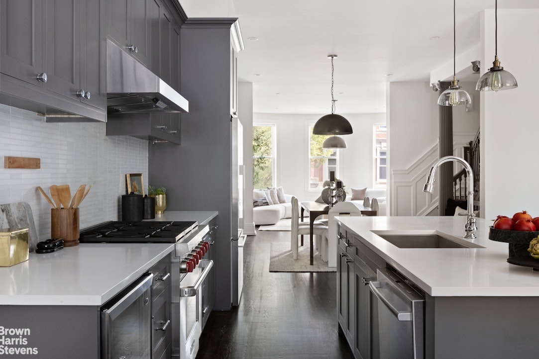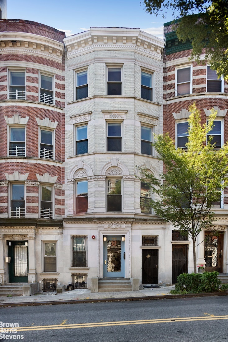 The entry makes a stunning first impression with a grand reception hall, soaring ceilings, and intricate decorative plasterwork and there is a rear bedroom on this level. On the parlor level above, the spacious, high-end kitchen is a chef's dream, outfitted with top-tier appliances, abundant storage, and direct access to a deck overlooking the landscaped backyard.