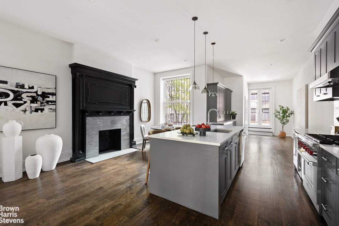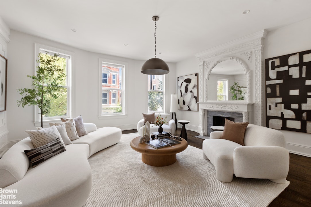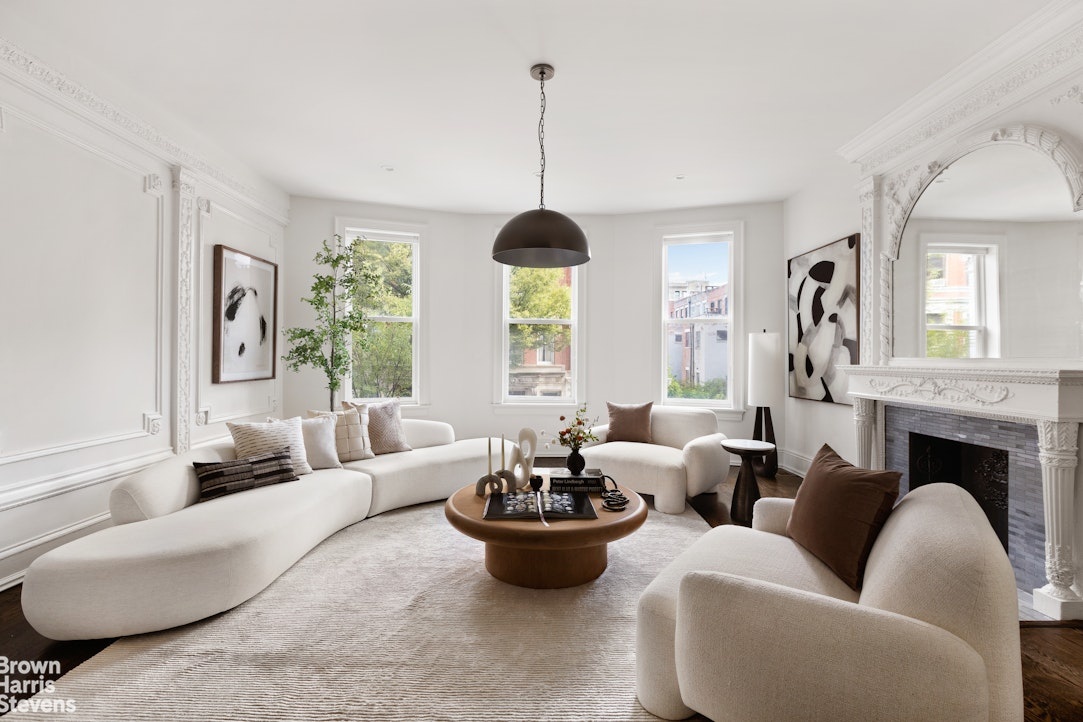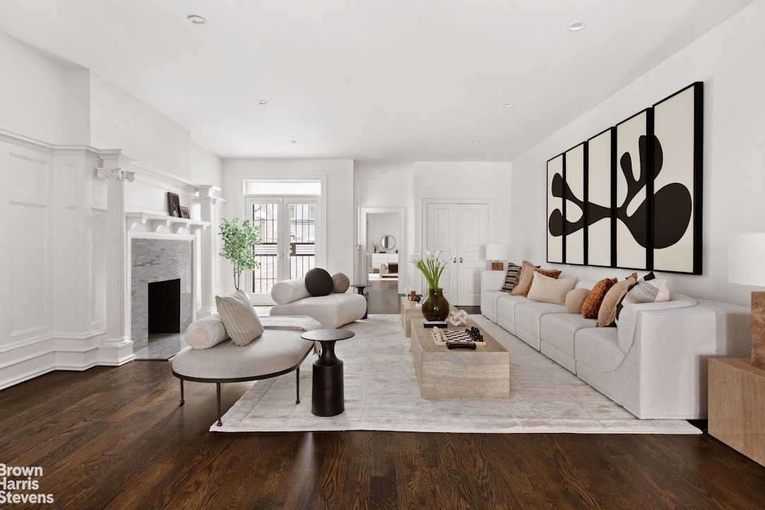 This 20-foot-wide home spans approximately 6,500 square feet across five bedrooms, four full bathrooms, and two powder rooms, offering space and sophistication in equal measure. Every detail has been thoughtfully considered, from the five restored historic fireplaces and original molding to the dark hardwood floors contrasting beautifully with crisp white walls.