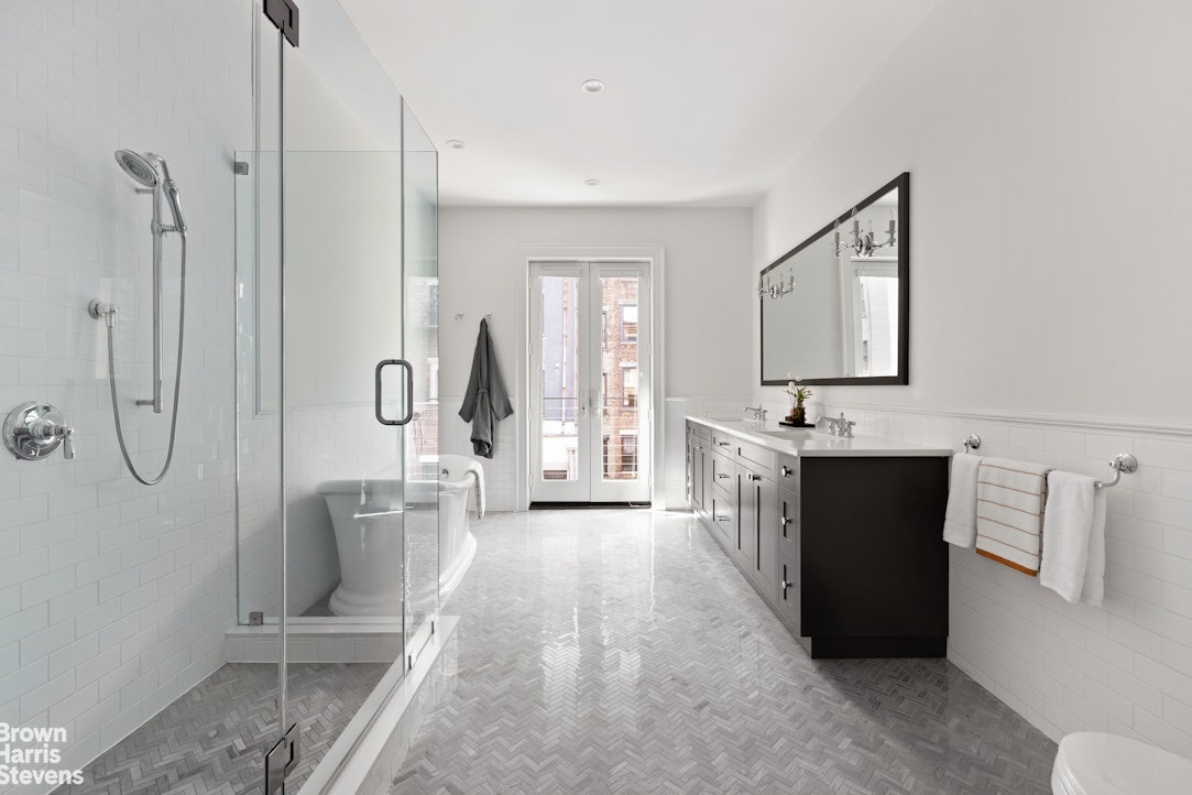 Upstairs, the floor-through primary suite is a private retreat featuring a luxurious bathroom with a freestanding soaking tub. Additional bedrooms are generously proportioned, each with custom finishes and ample closet space. Bathrooms throughout the home are meticulously tiled, blending modern design with a refined, classic sensibility.