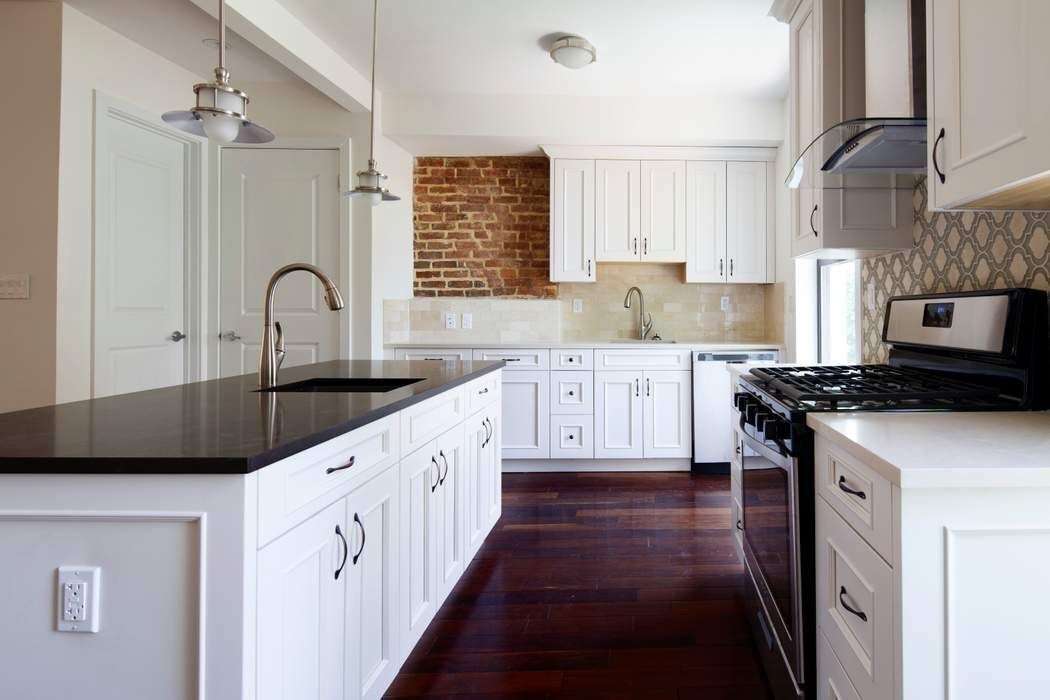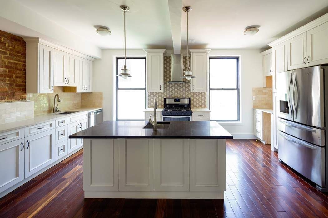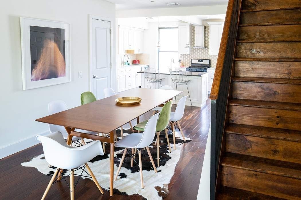 Inside, the home spans two full floors and approximately 1,680+/- square feet. At the heart of the residence is a bright chef’s kitchen framed by exposed brick and oversized windows, featuring a large center island, stainless steel appliances, and generous cabinetry. The adjoining dining and living areas create a welcoming flow, highlighted by hardwood floors and original details.