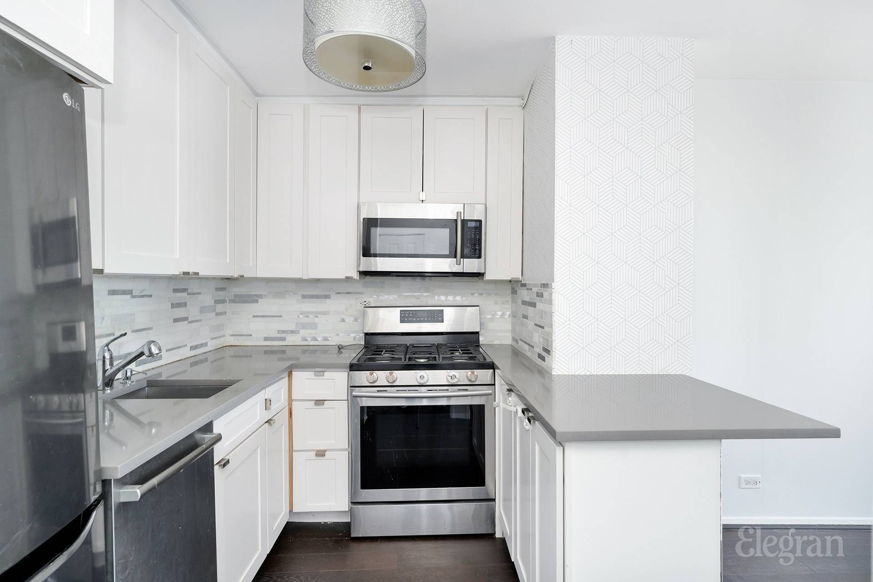 The renovated kitchen features stainless steel appliances and stone countertops. The spacious living/dining area includes built-in shelving and room for entertaining. The corner bedroom offers ample closet space and wraparound windows with eastern and southern exposures.