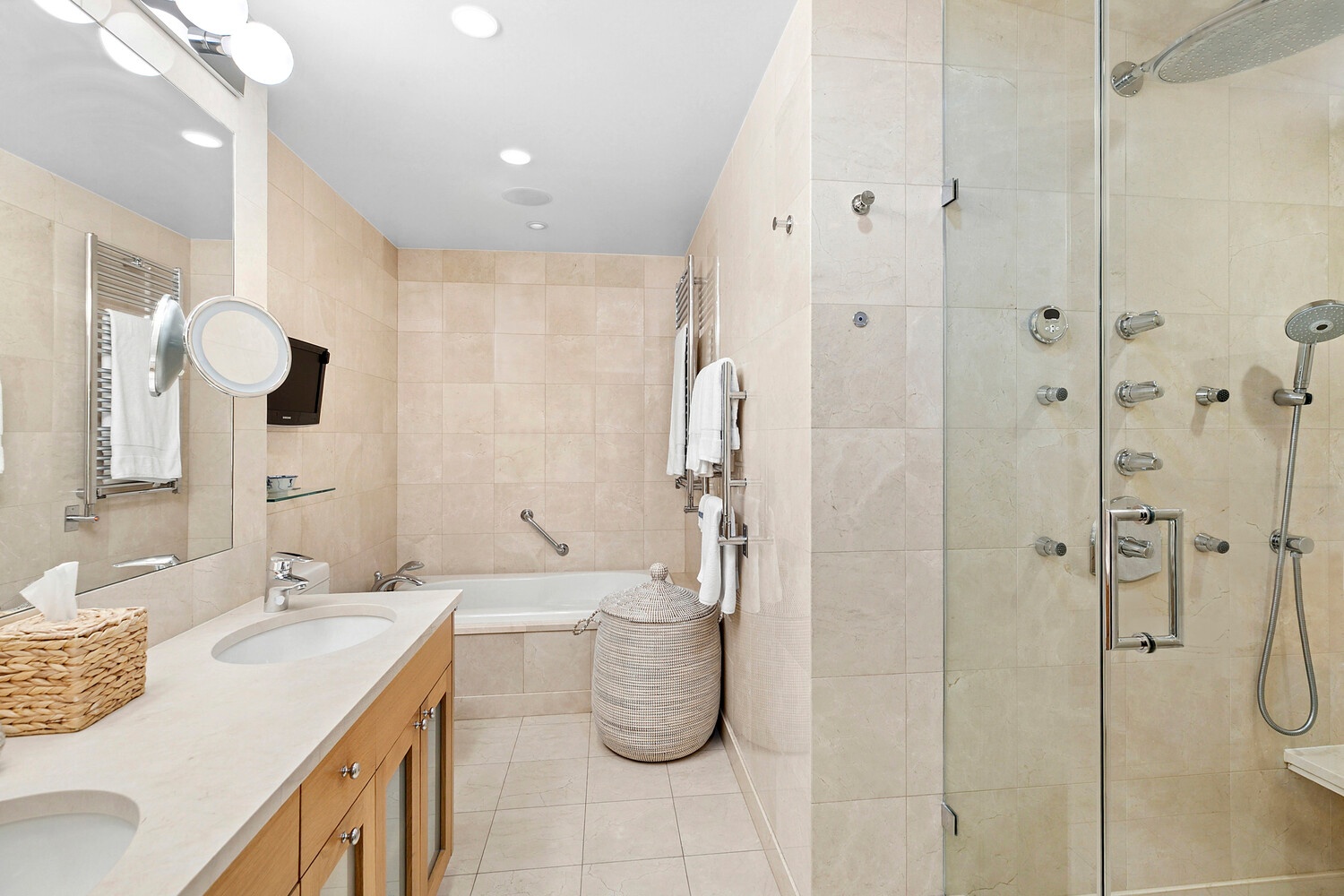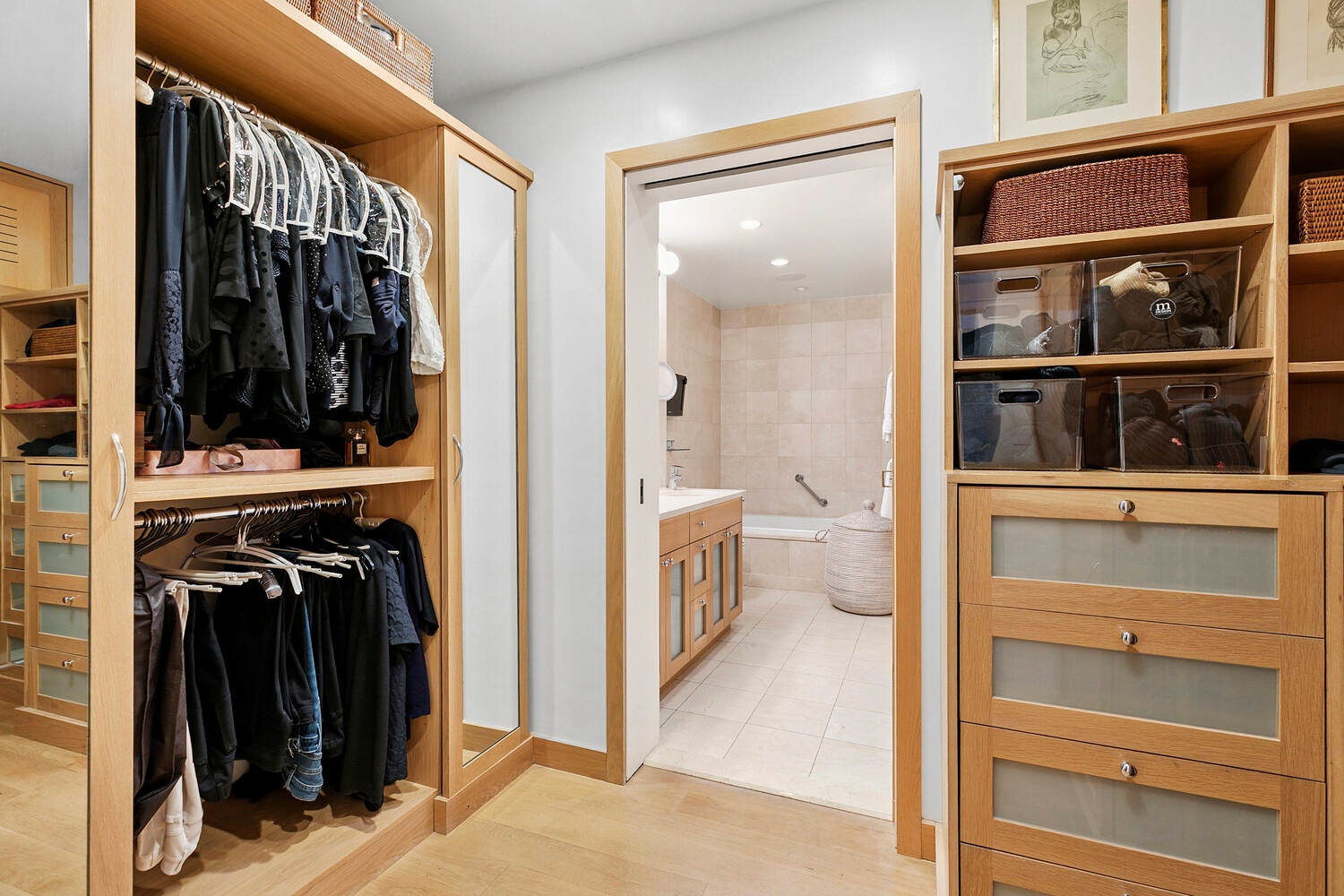 The serene oversized primary suite is a private sanctuary, offering a wall of closets, a custom dressing area, and a spa-inspired en-suite bath featuring a steam shower with an oversized rain shower head. Throughout the residence, custom storage solutions, privacy shades, and a pin-drop quiet ambiance elevate daily living to a new level of comfort.