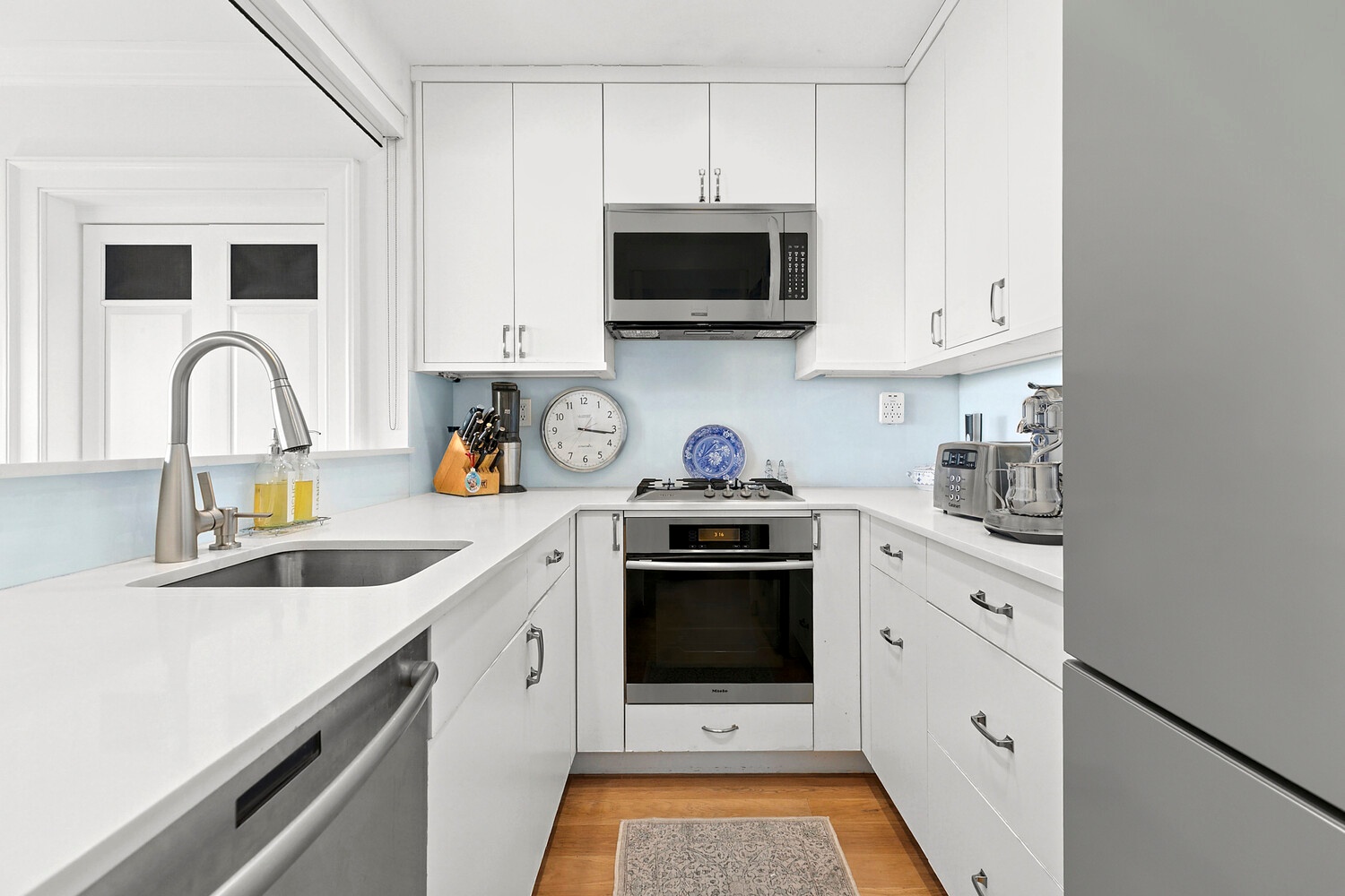 The expansive dining area flows gracefully into a sun-drenched living room, where oversized picture windows frame iconic park vistas and create a dramatic backdrop for entertaining. The well-appointed kitchen, complete with a generous pass-through and abundant cabinetry, is equally suited to casual meals or formal gatherings.